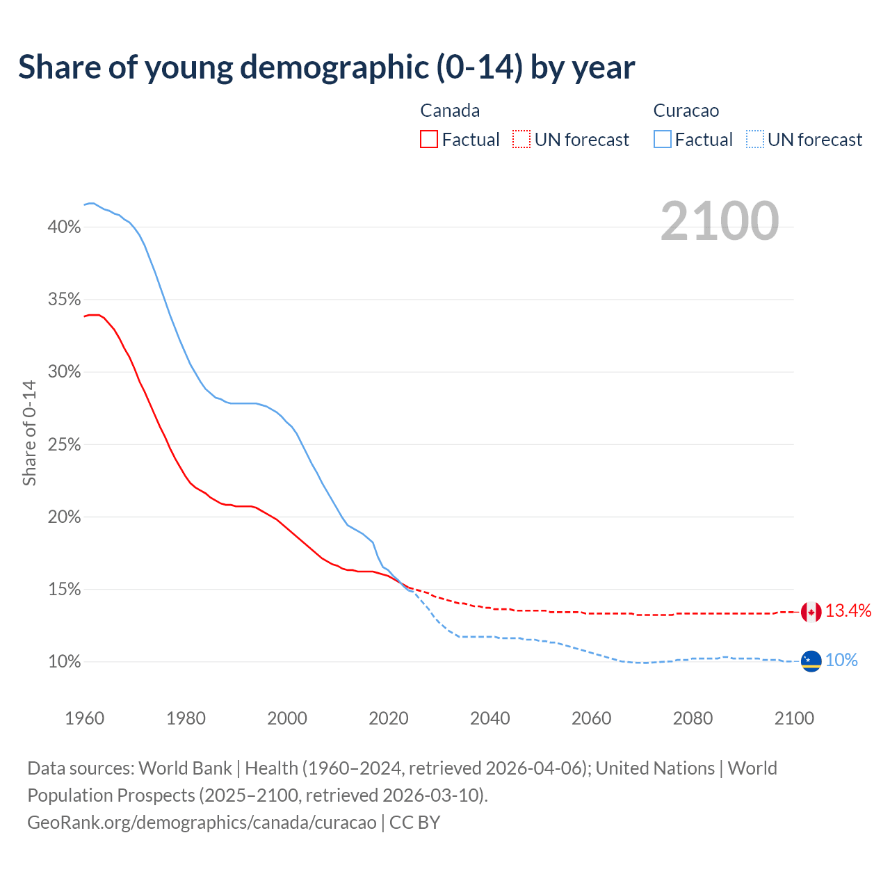 - The share of young demographic (0-15 years old) in Canada is 15.1% vs 14.9% in Curacao.