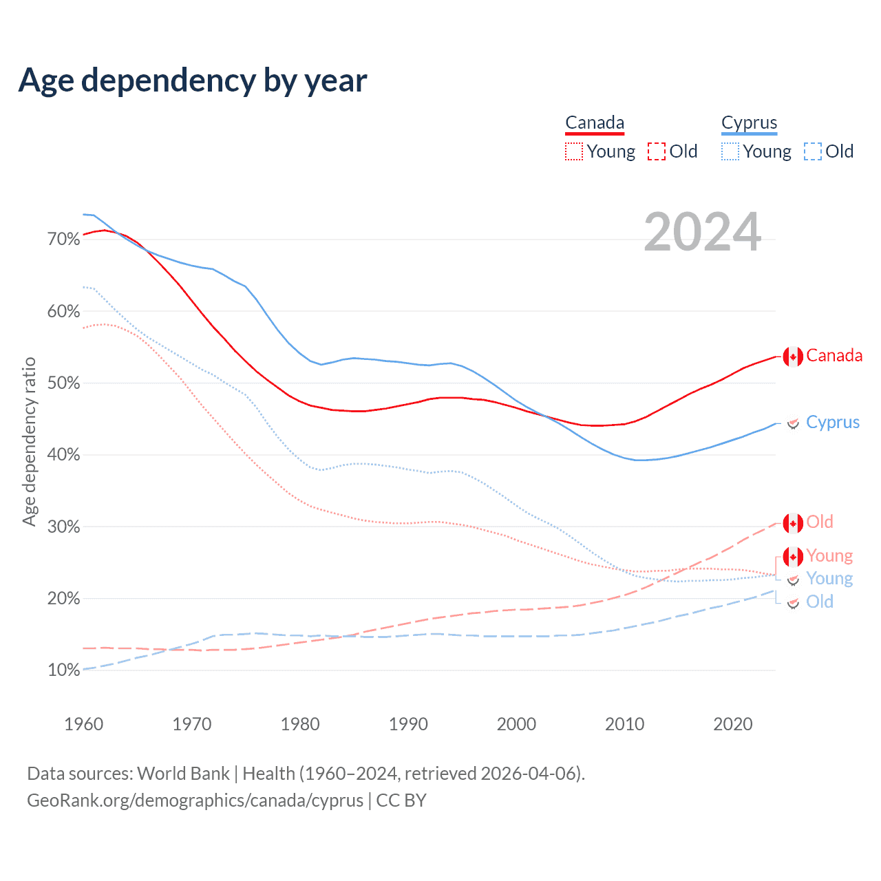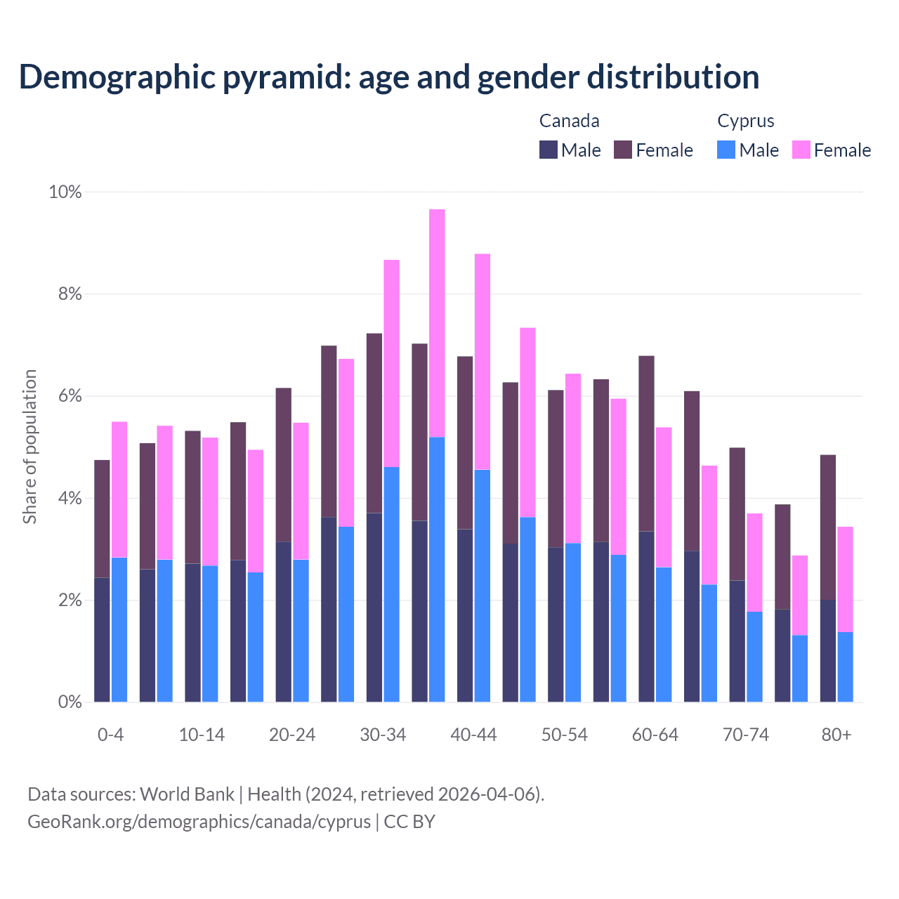 - Canada is ranked 38/196 by median age (oldest to youngest) vs 52/196 for Cyprus.