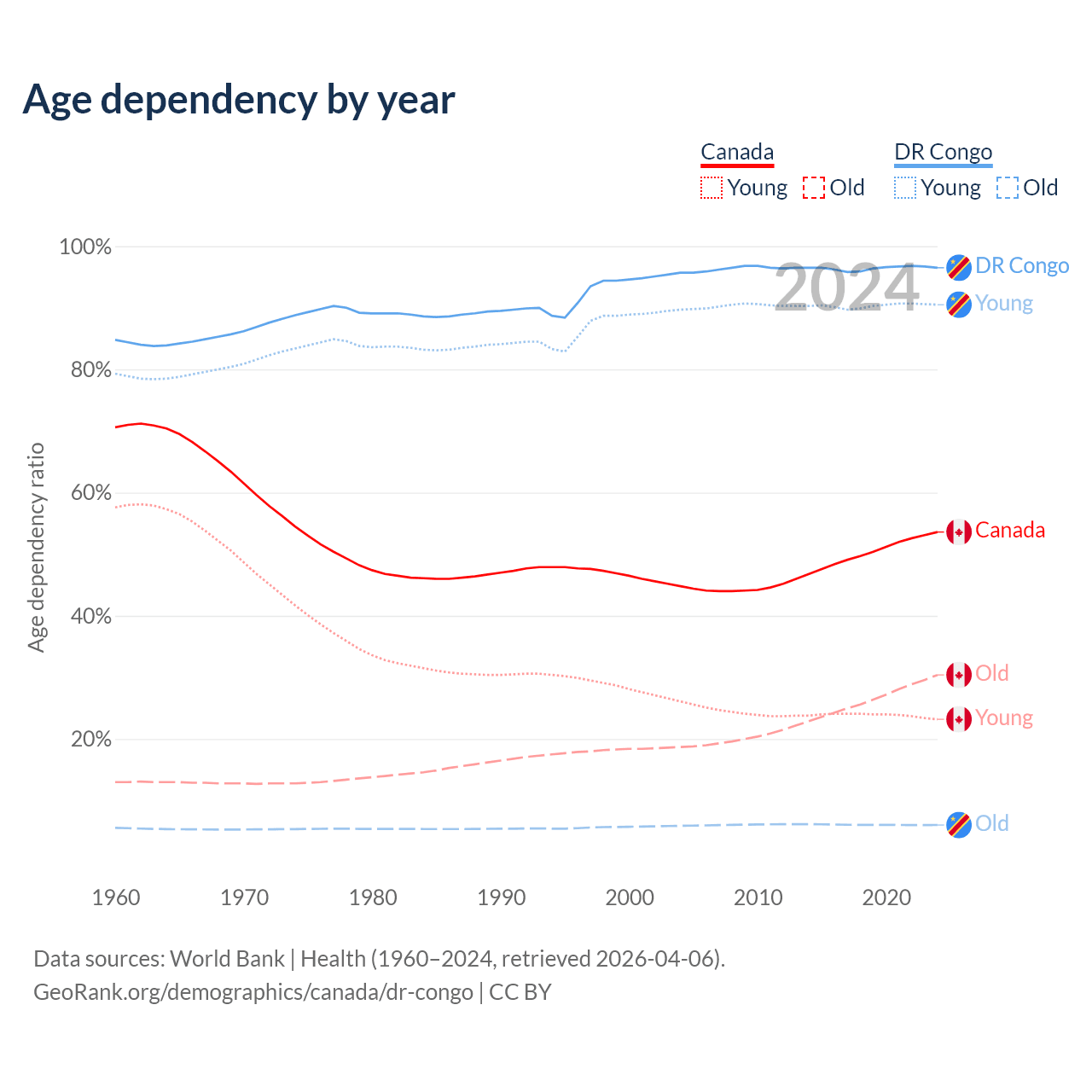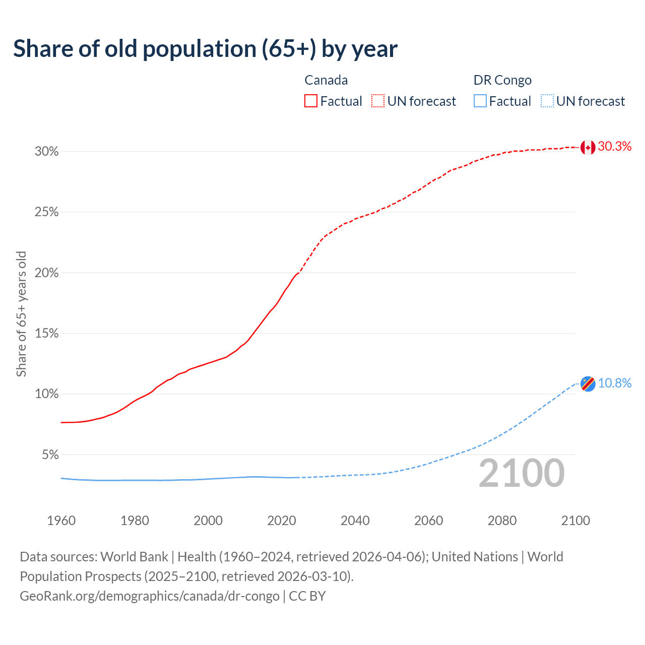The share of older people aged 65 and over is 19.8% in Canada and 3.08% in the DR Congo. Life expectancy in Canada compared to the DR Congo .