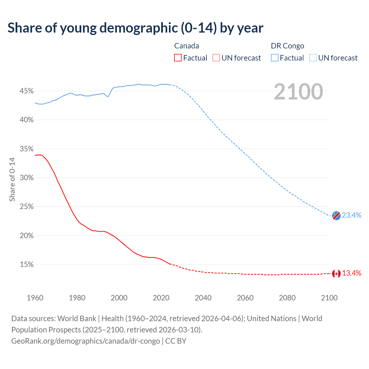 - The share of young demographic (0-15 years old) in Canada is 15.1% vs 46% in the DR Congo.