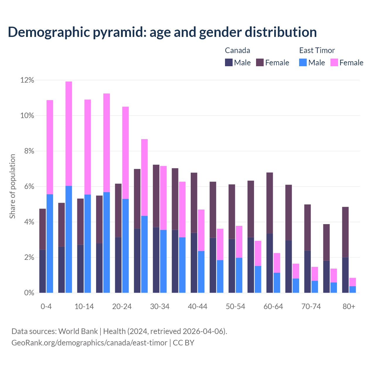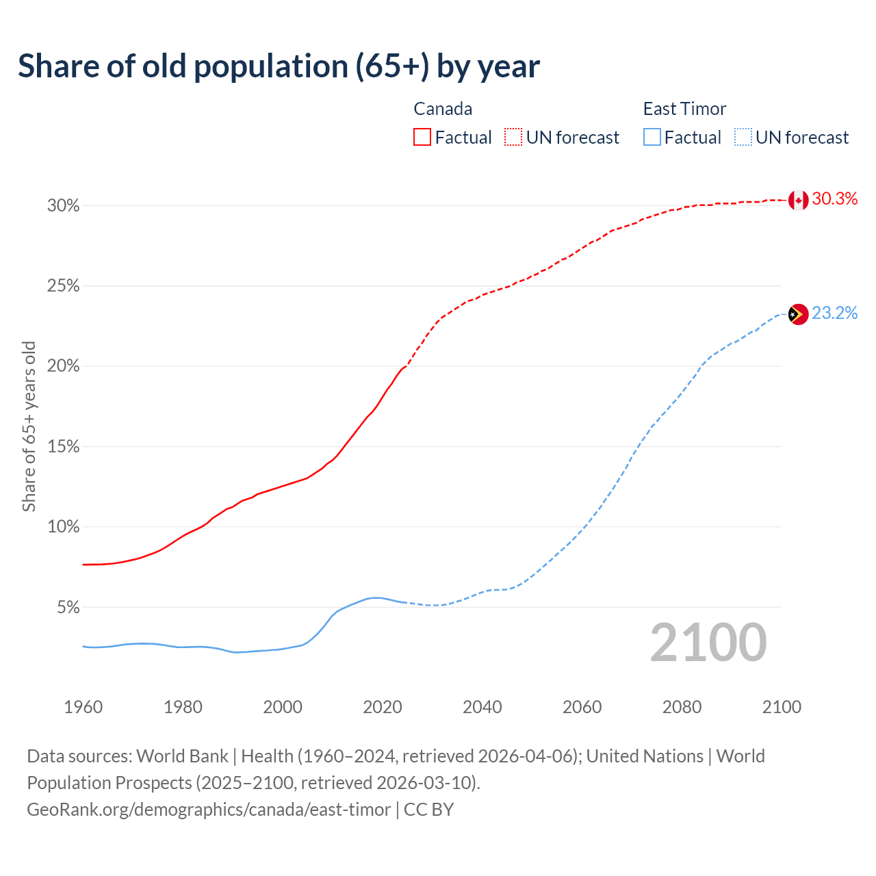 - The share of old-age demographic (65+) in Canada is 19.8% vs 5.28% in East Timor.
