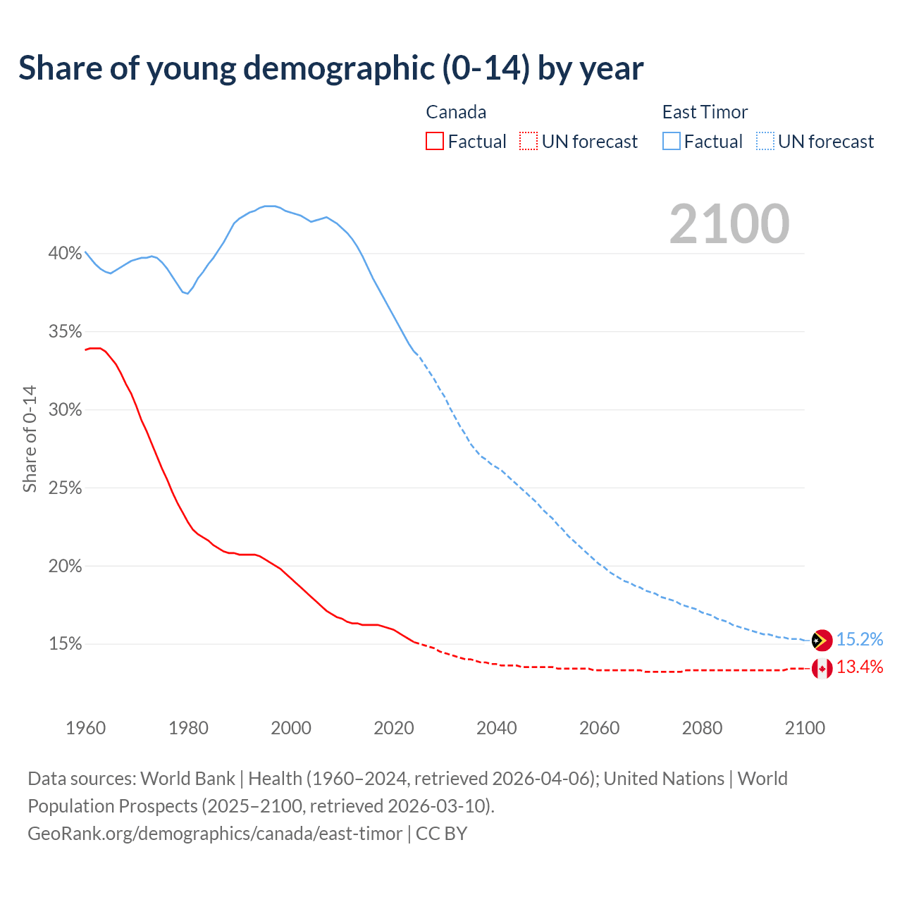 - The share of young demographic (0-15 years old) in Canada is 15.1% vs 33.7% in East Timor.