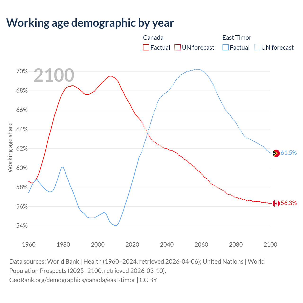 - Canada has 27.5M working age adults (aged 15-64) vs 880K in East Timor.