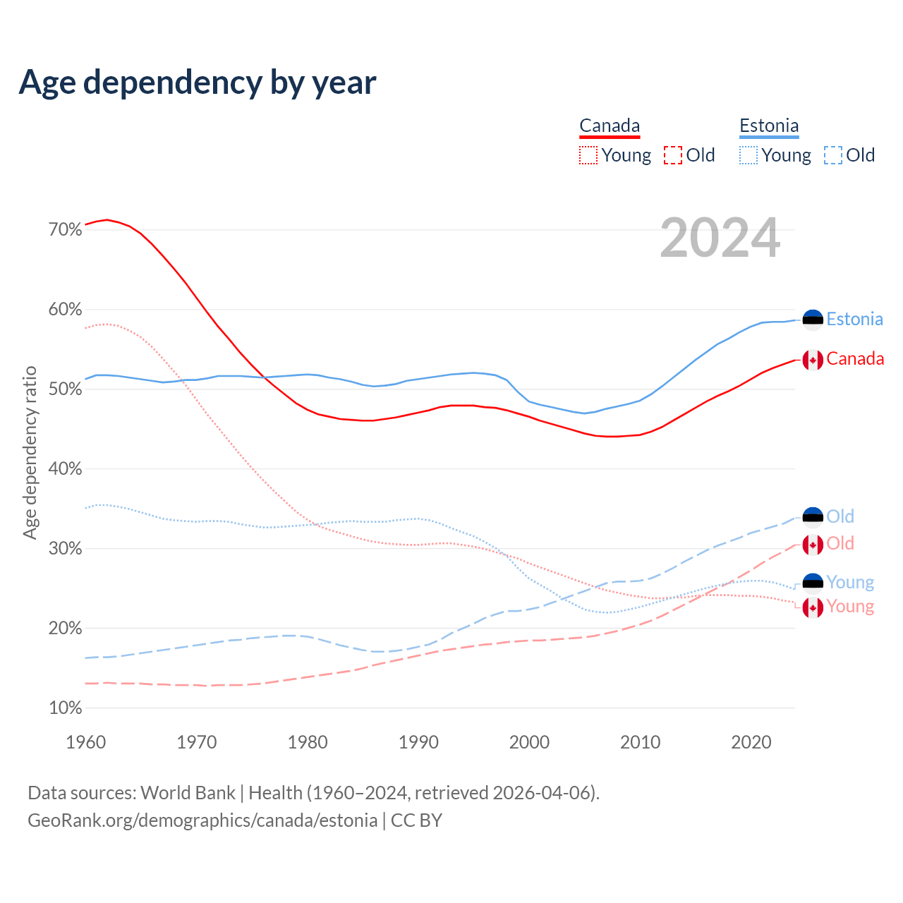 Data sources: World Bank | Health (1960–2024, retrieved 2026-04-06); U.S. Census Bureau (1960–2024, retrieved 2026-02-08).