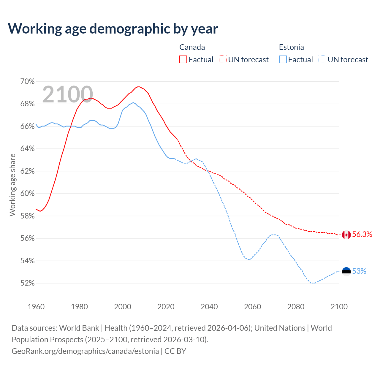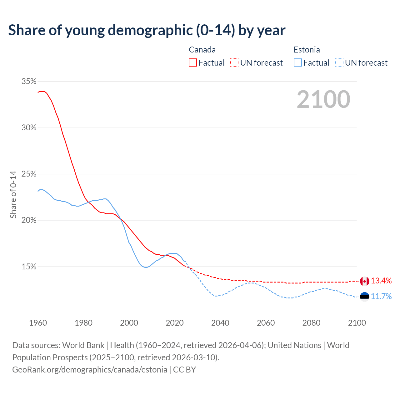 - The share of young demographic (0-15 years old) in Canada is 15.1% vs 15.6% in Estonia.