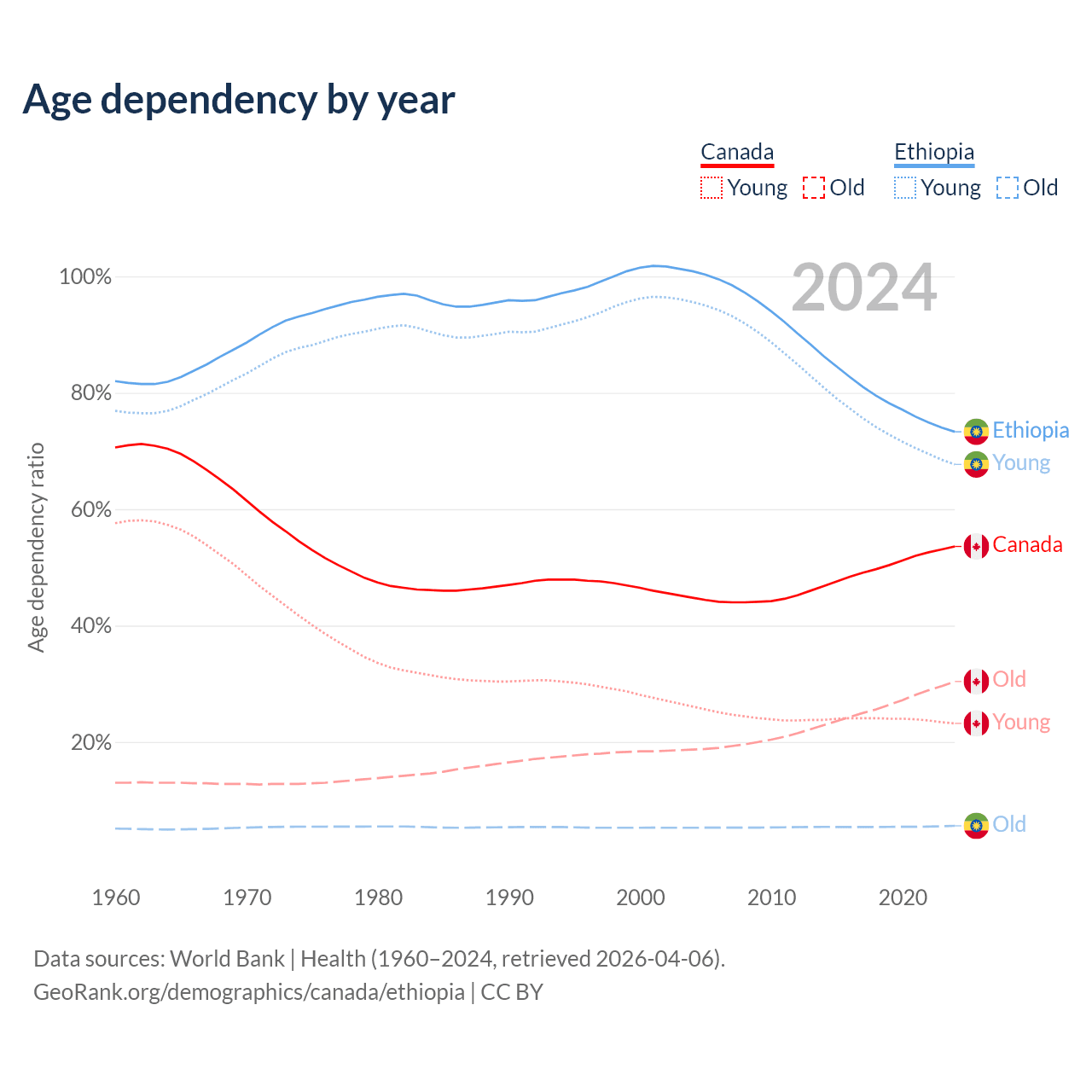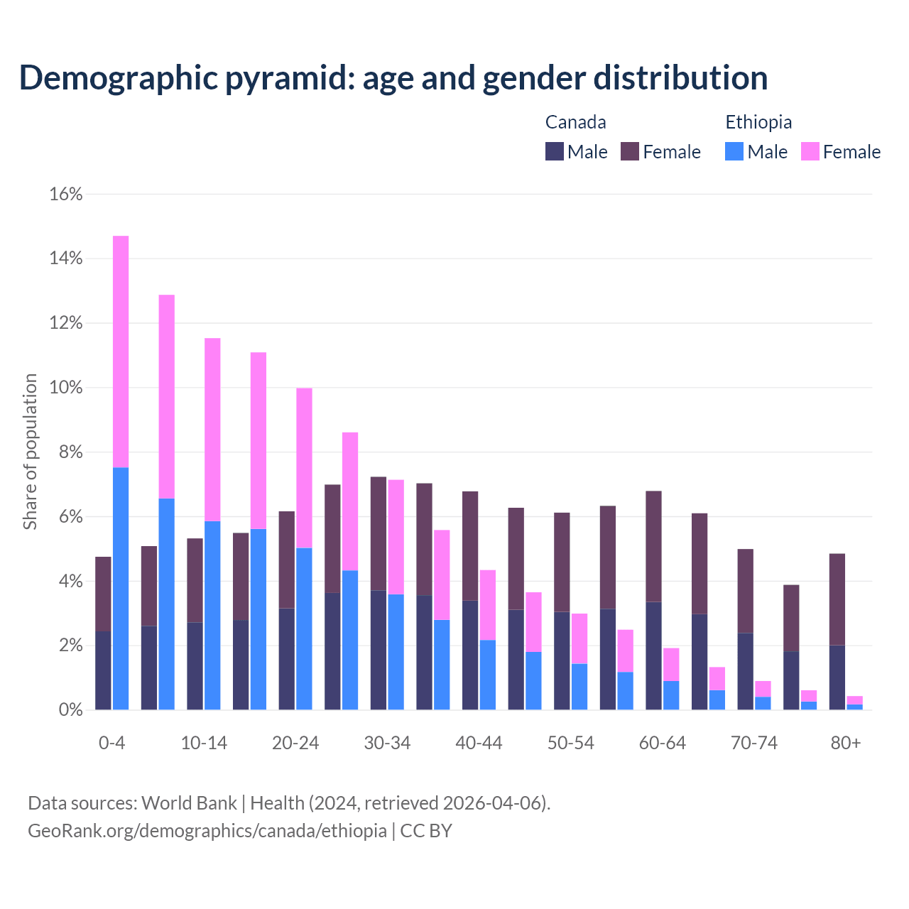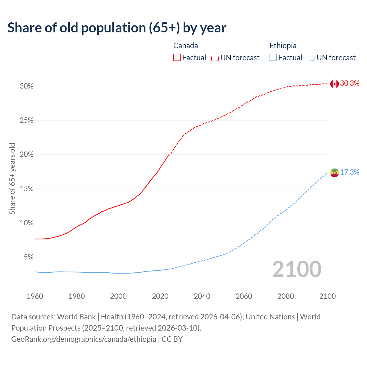 - The share of old-age demographic (65+) in Canada is 19.8% vs 3.23% in Ethiopia.