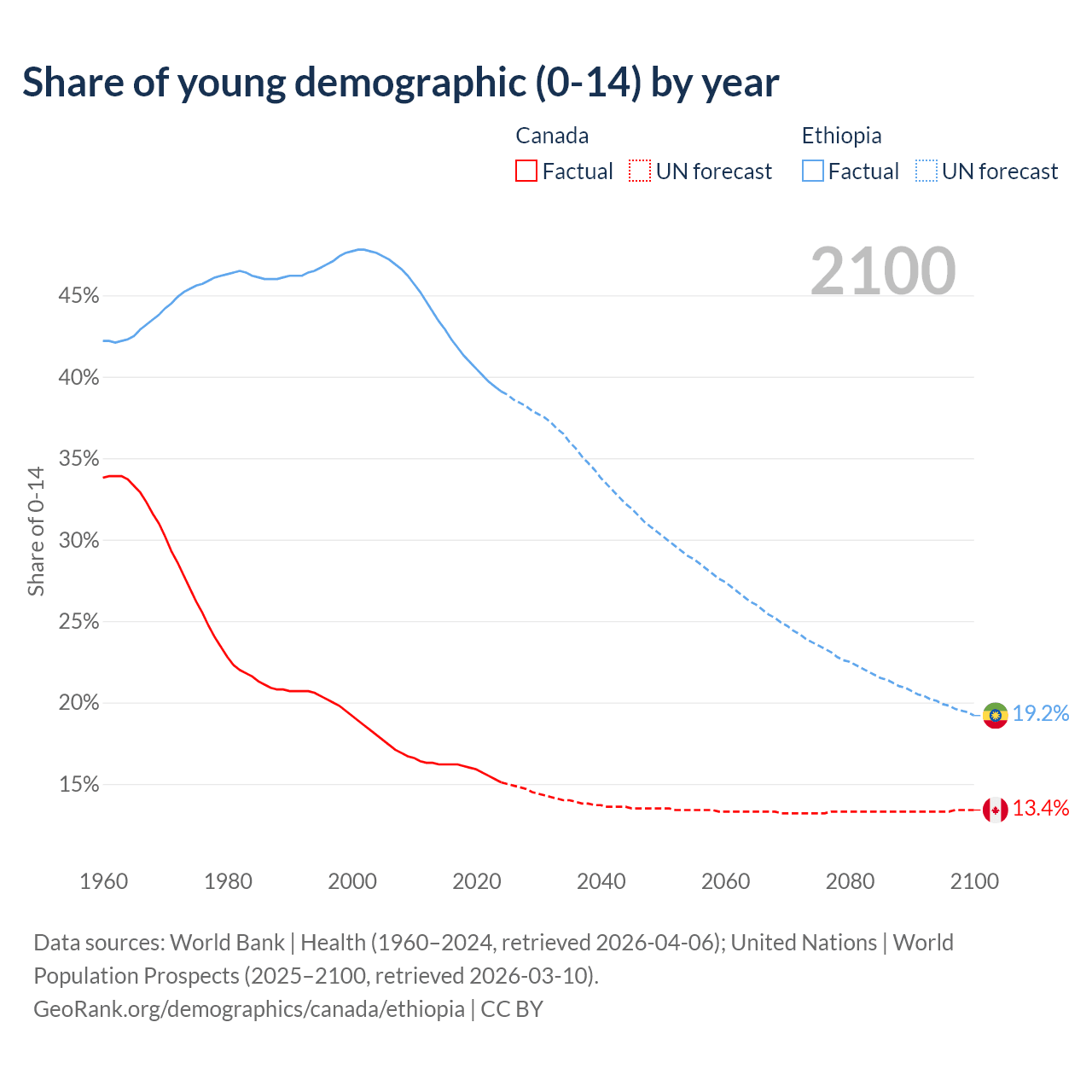 - The share of young demographic (0-15 years old) in Canada is 15.1% vs 39.1% in Ethiopia.