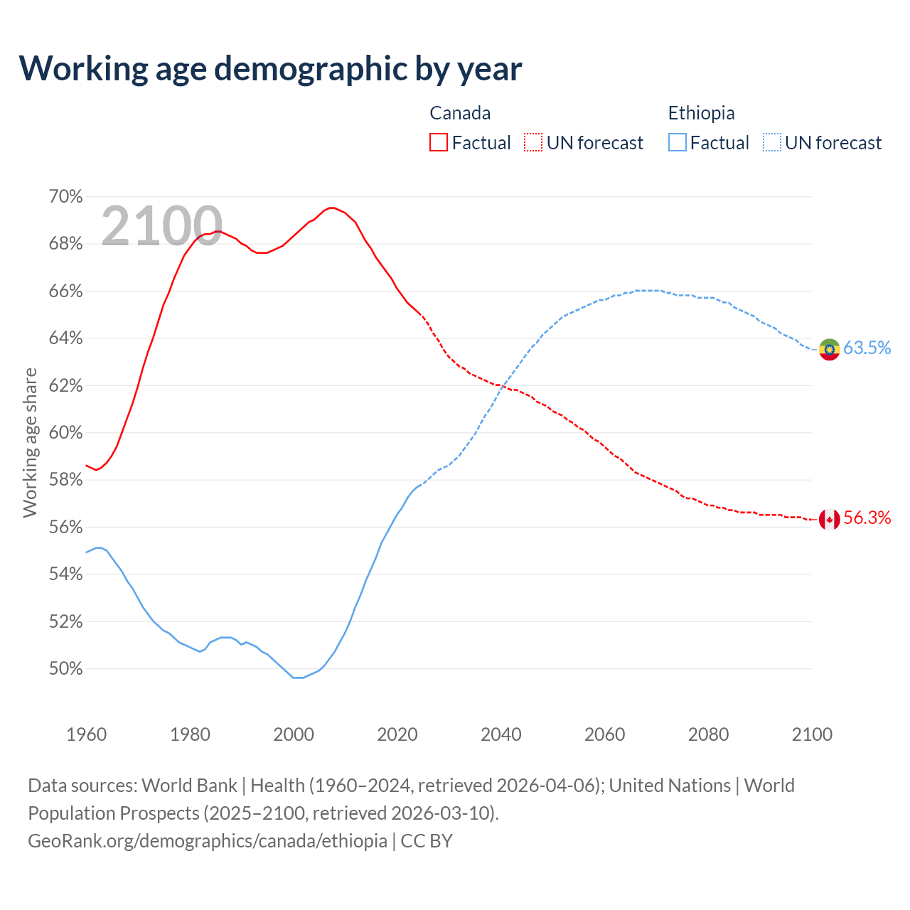 - Canada has 27.5M working age adults (aged 15-64) vs 80.7M in Ethiopia.