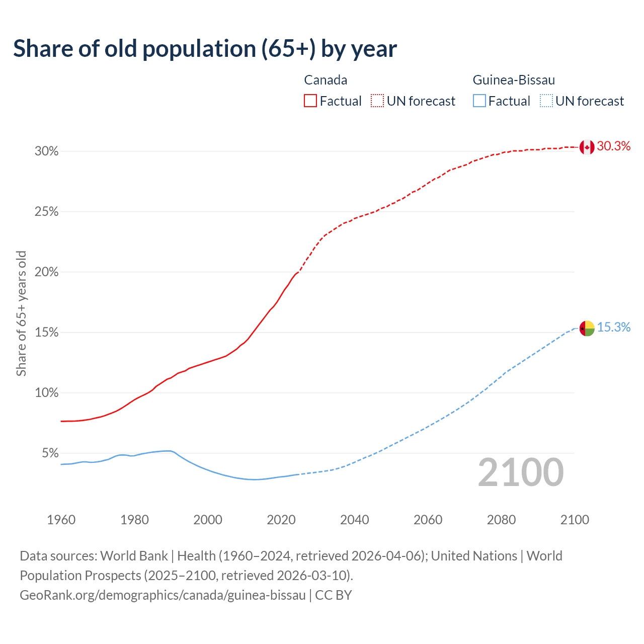 - The share of old-age demographic (65+) in Canada is 19.8% vs 3.19% in Guinea-Bissau.