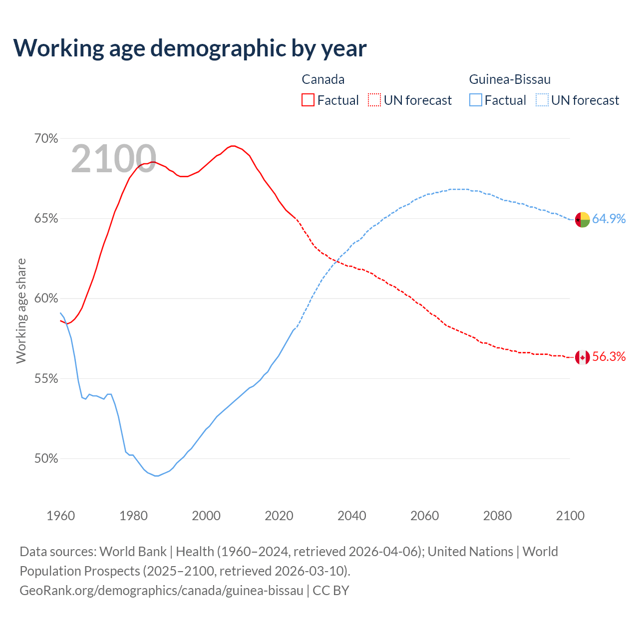 - Canada has 27.5M working age adults (aged 15-64) vs 1.34M in Guinea-Bissau.