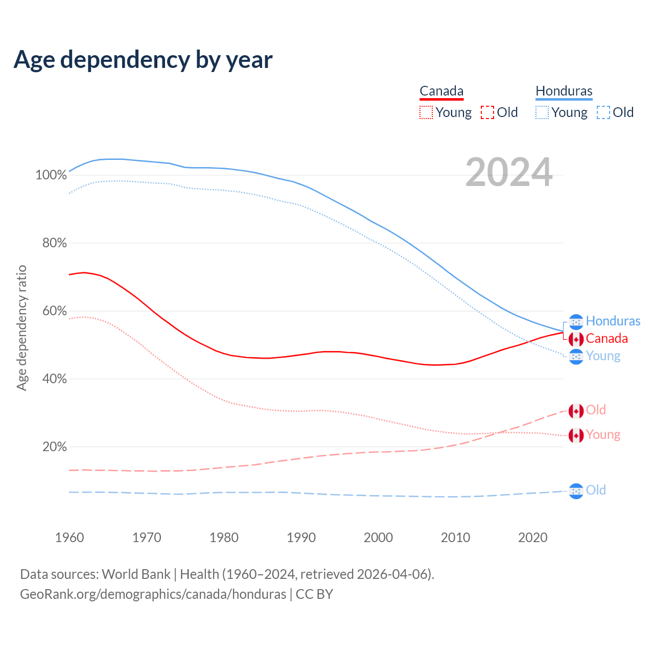 Data sources: World Bank | Health (1960–2024, retrieved 2026-04-06); U.S. Census Bureau (1960–2024, retrieved 2026-02-08).