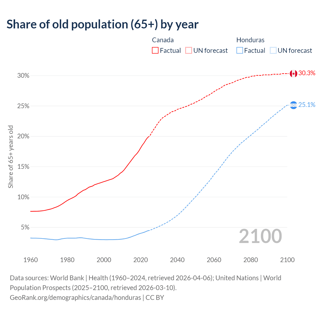 The share of older people aged 65 and over is 19.8% in Canada and 4.42% in Honduras. Life expectancy in Canada compared to Honduras .