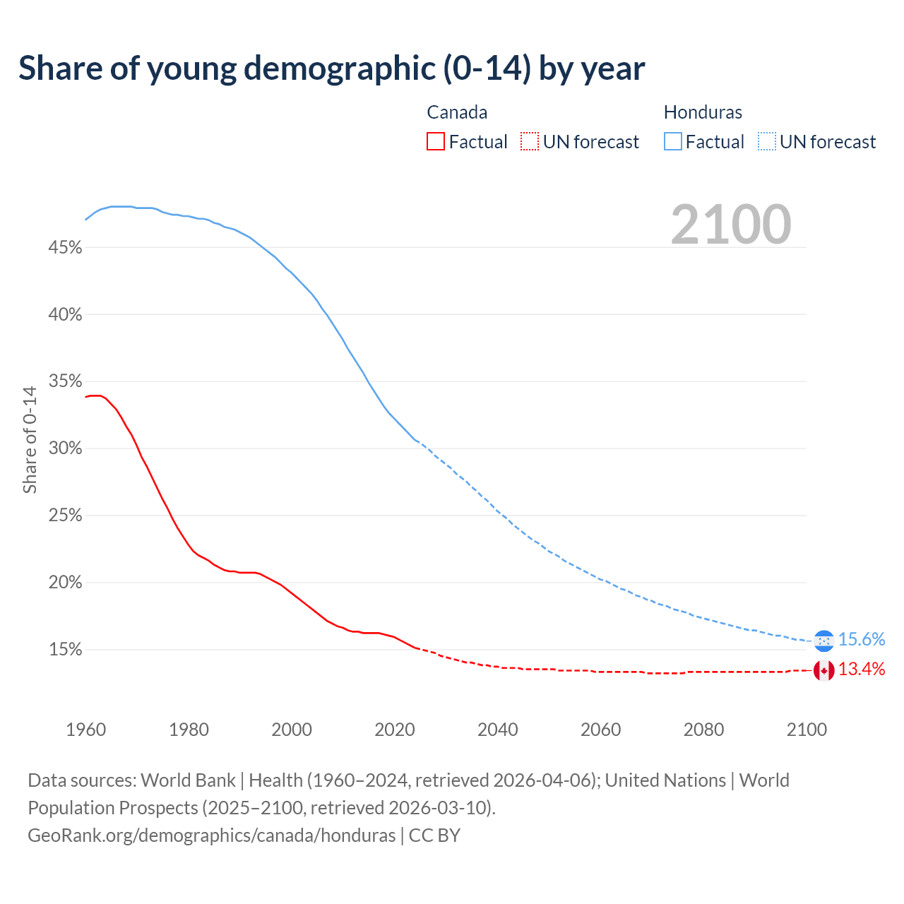 - The share of young demographic (0-15 years old) in Canada is 15.1% vs 30.6% in Honduras.
