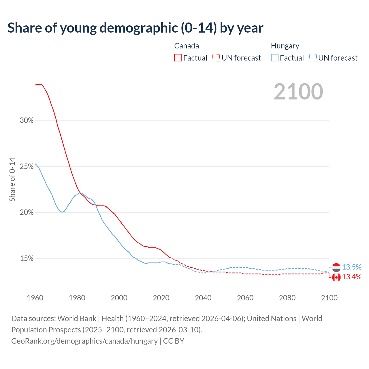 - The share of young demographic (0-15 years old) in Canada is 15.1% vs 14.4% in Hungary.