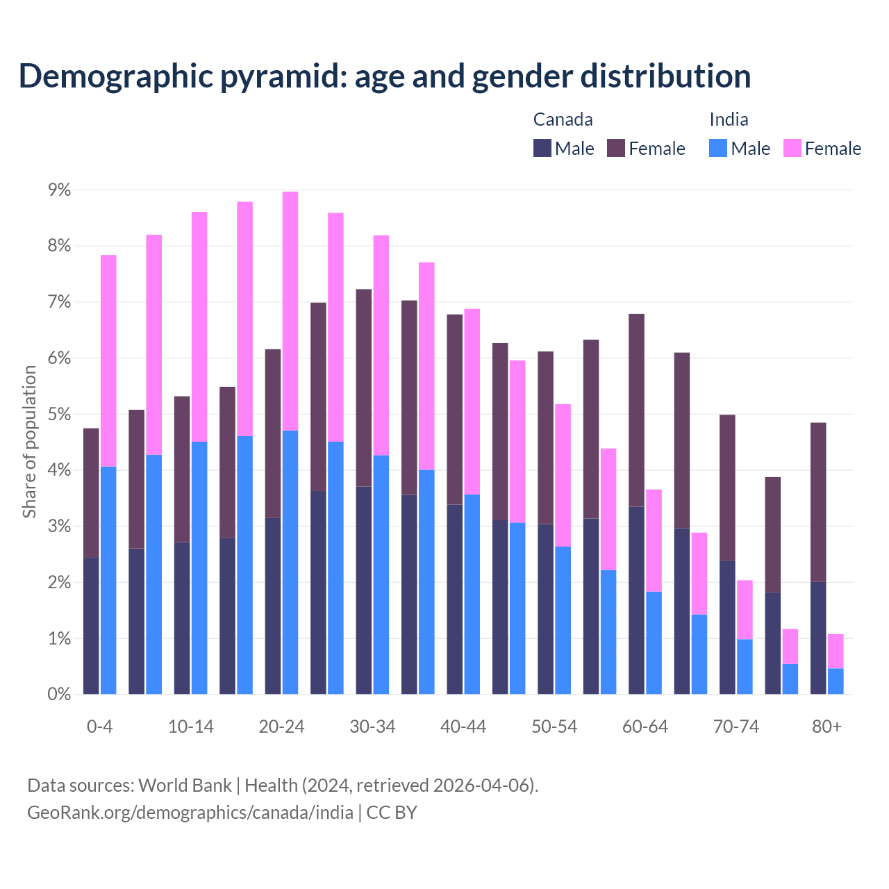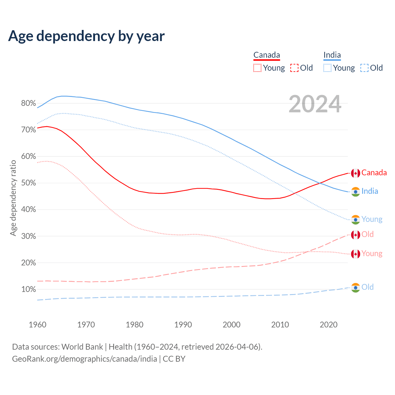 - Canada is ranked 38/196 by median age (oldest to youngest) vs 108/196 for India.