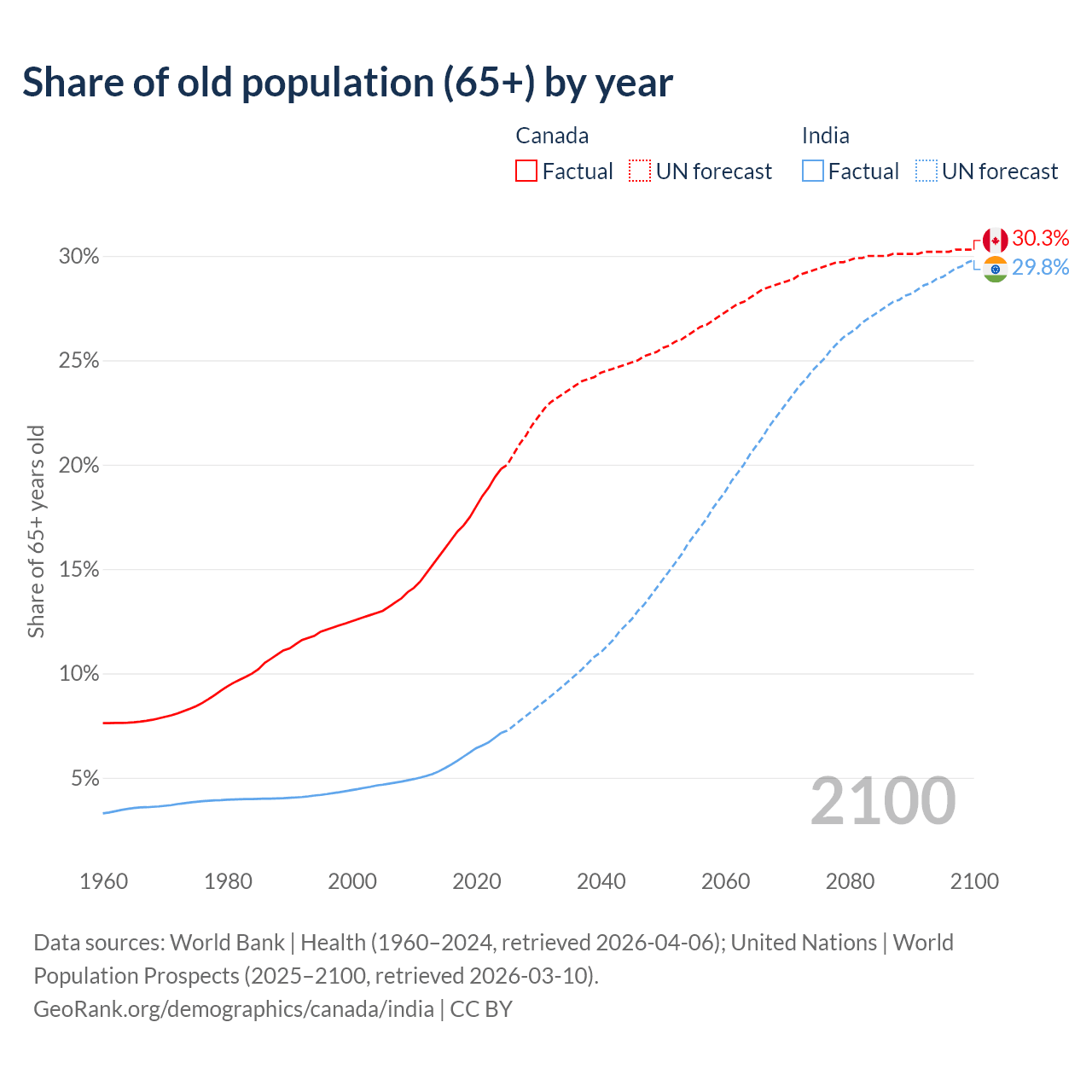 The share of older people aged 65 and over is 19.8% in Canada and 7.15% in India. Life expectancy in Canada compared to India .