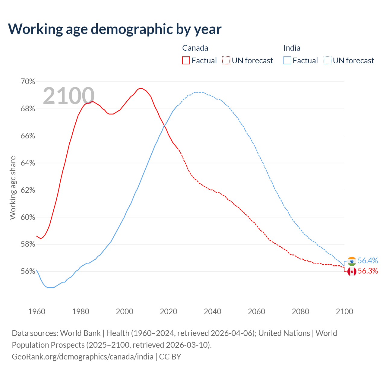 - Canada has 27.5M working age adults (aged 15-64) vs 1.01B in India.
