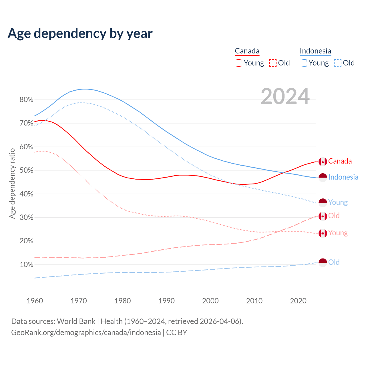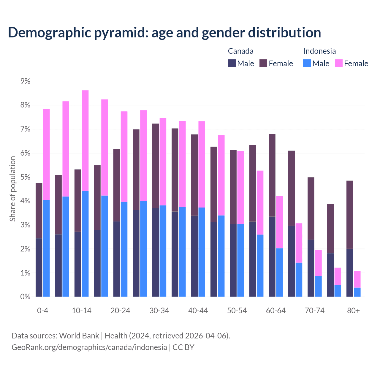 - Canada is ranked 38/196 by median age (oldest to youngest) vs 93/196 for Indonesia.