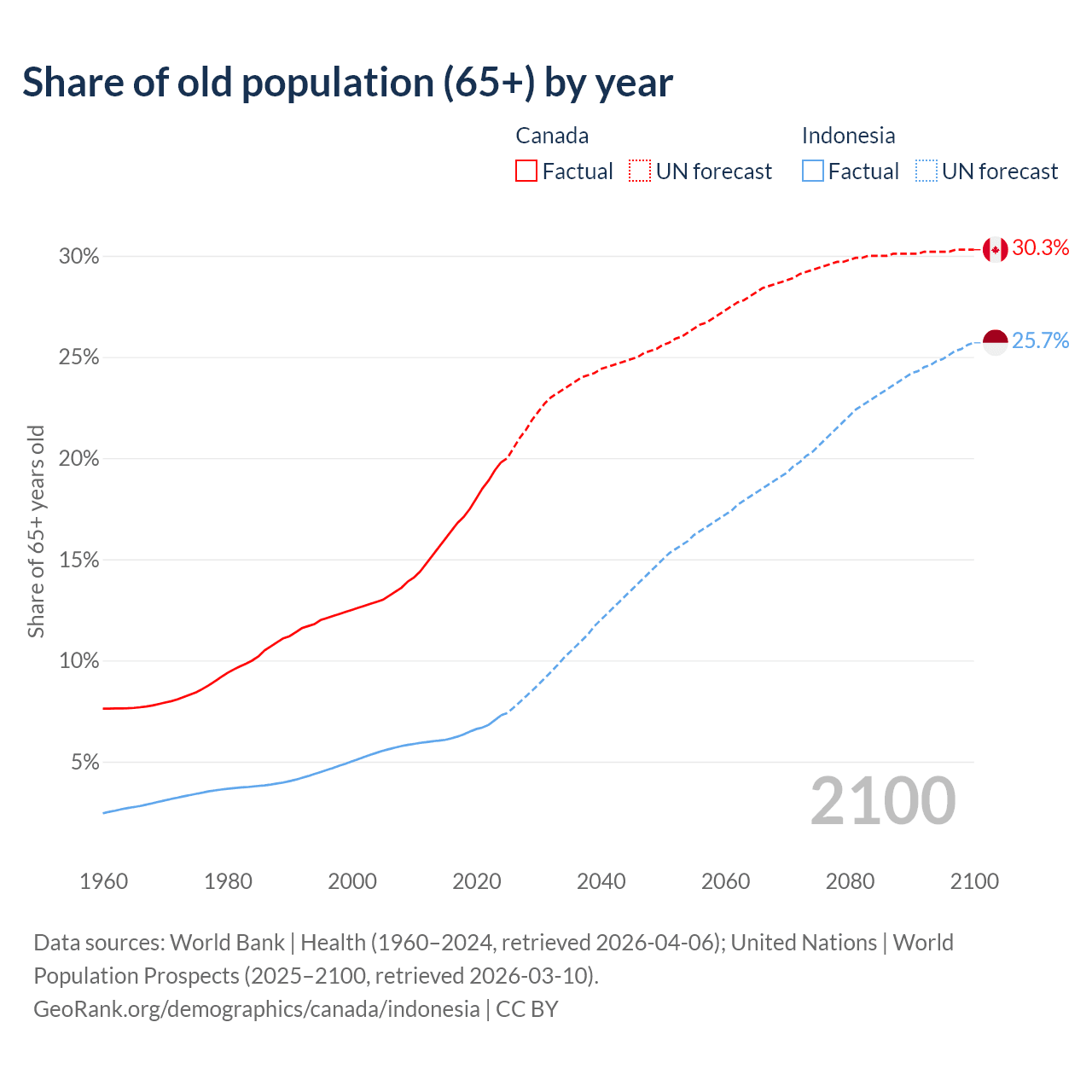 Median age Canada vs Indonesia, 1960-2100