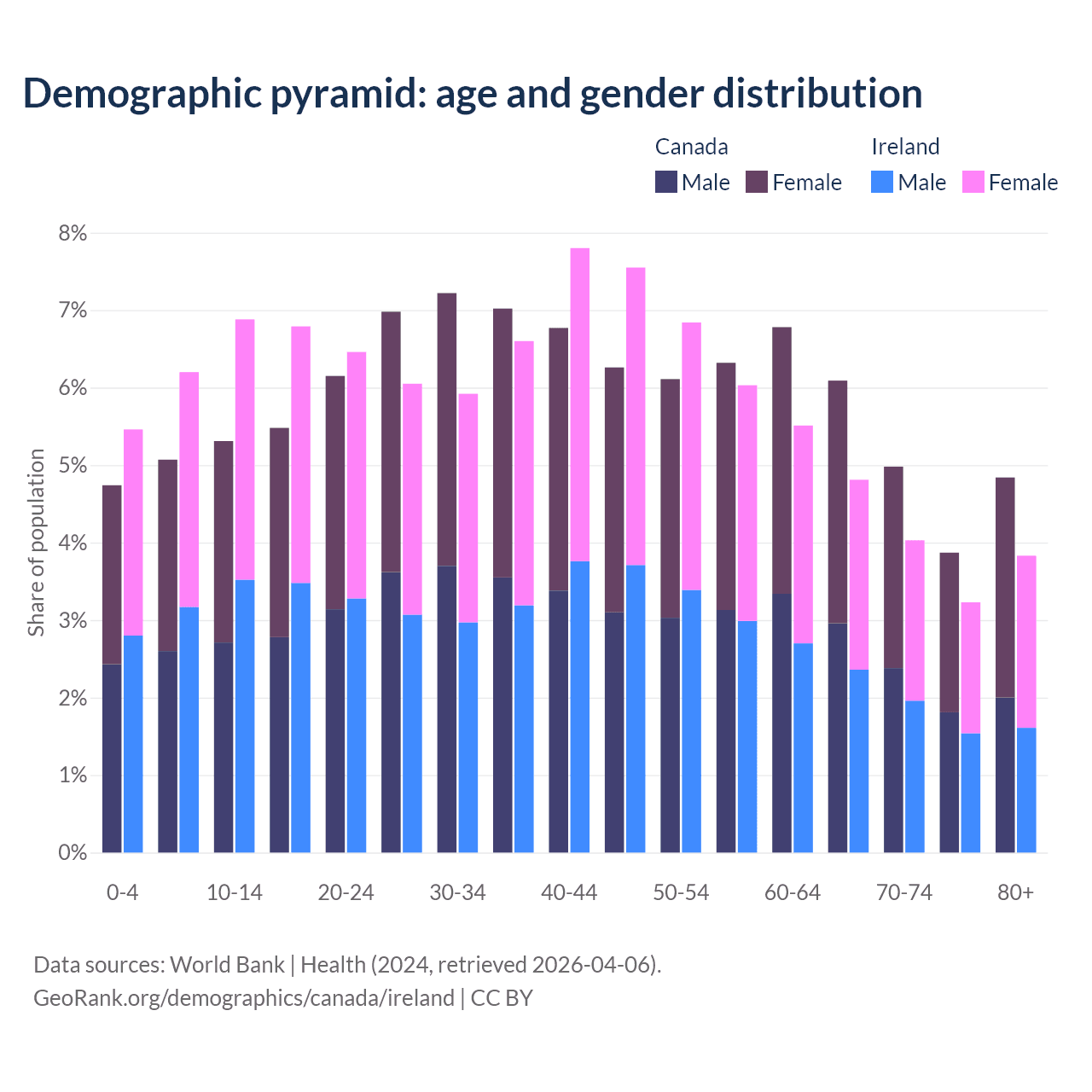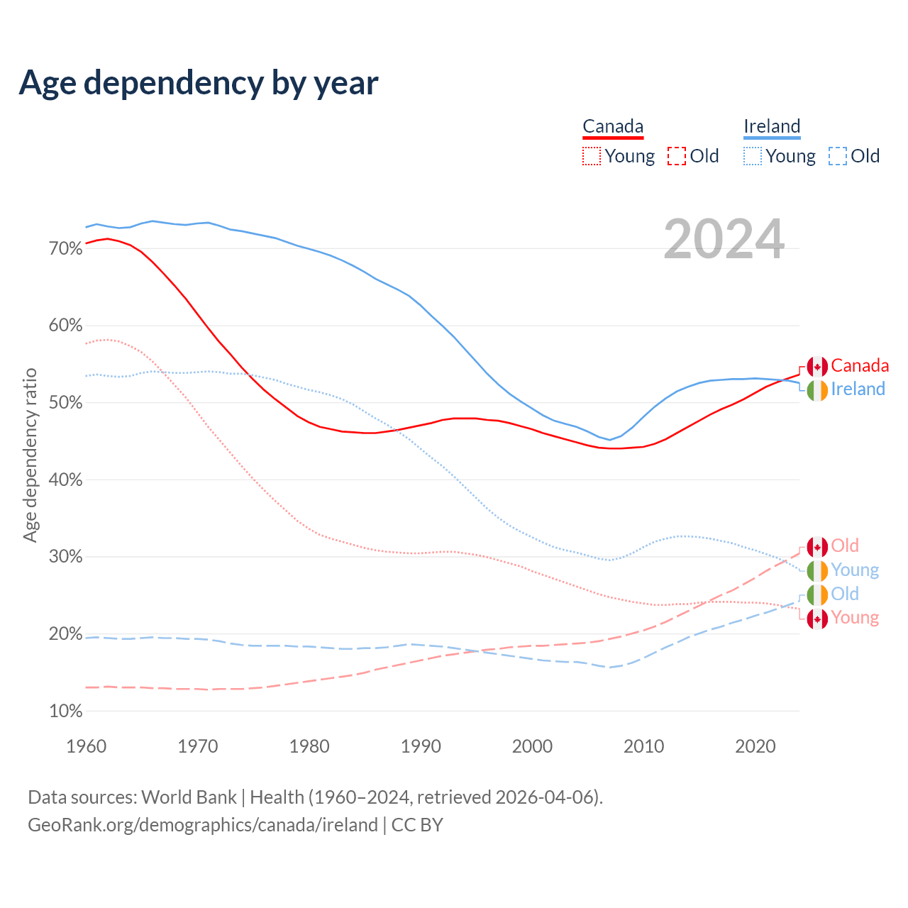 - Canada is ranked 38/196 by median age (oldest to youngest) vs 48/196 for Ireland.