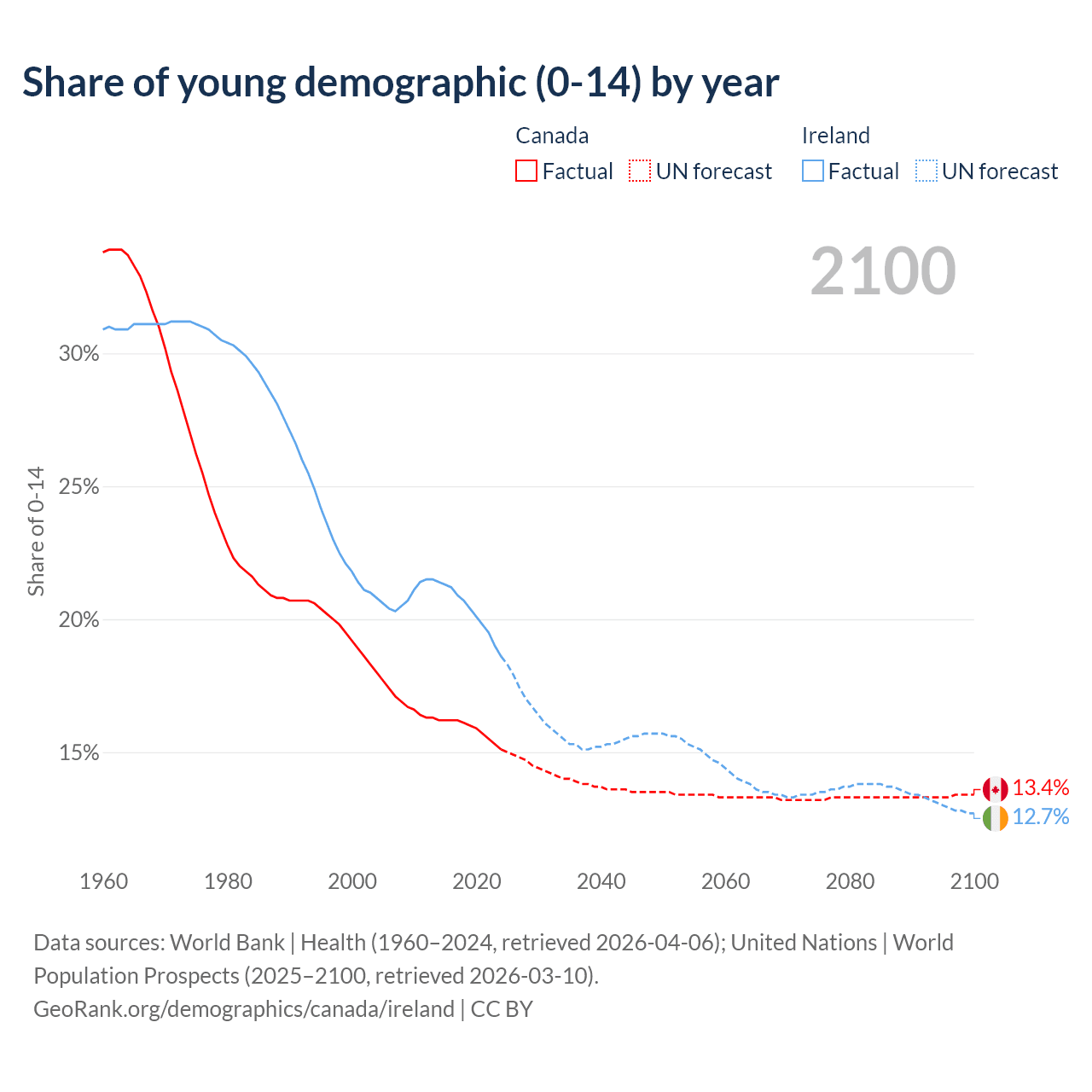 - The share of young demographic (0-15 years old) in Canada is 15.1% vs 18.6% in Ireland.