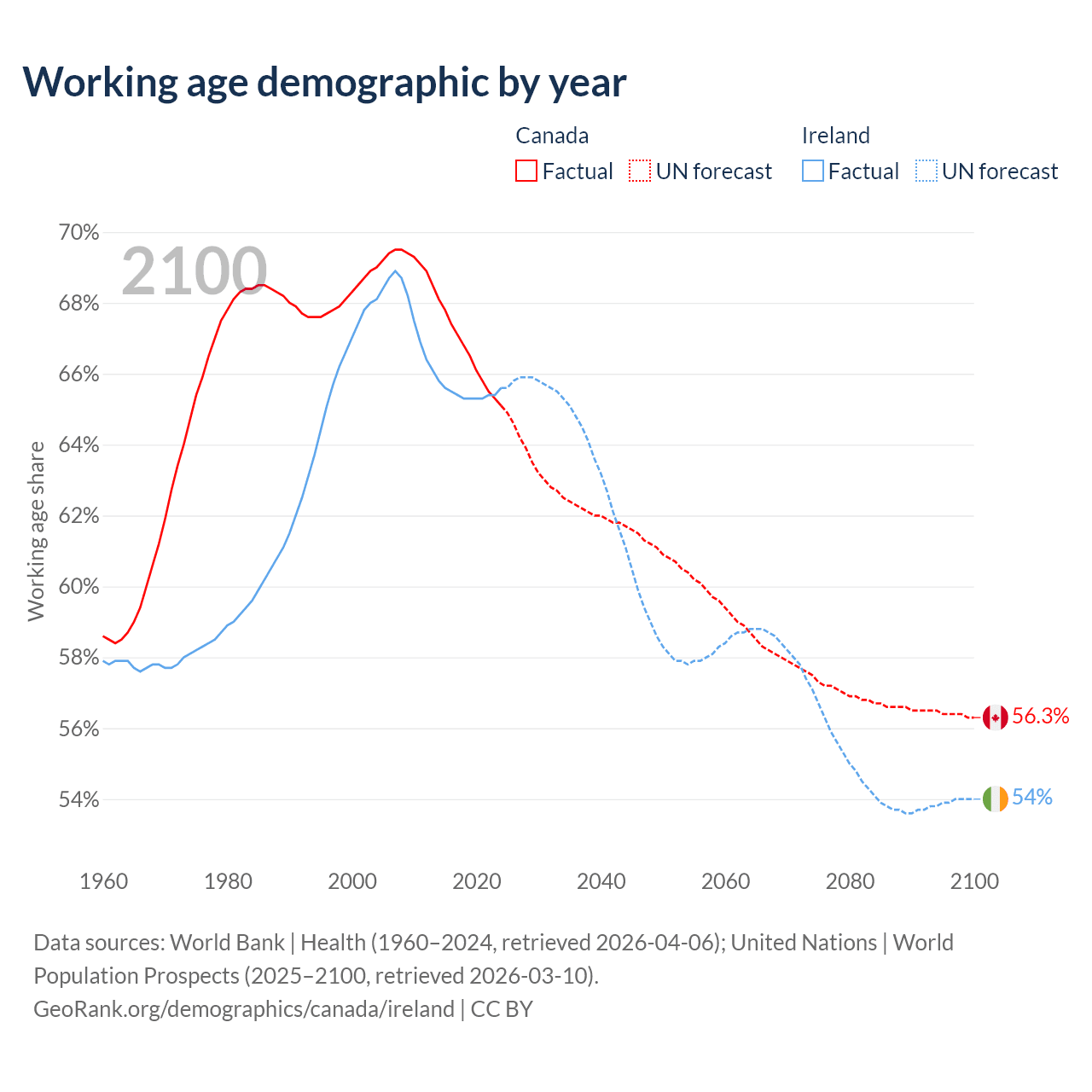 - Canada has 27.5M working age adults (aged 15-64) vs 3.62M in Ireland.