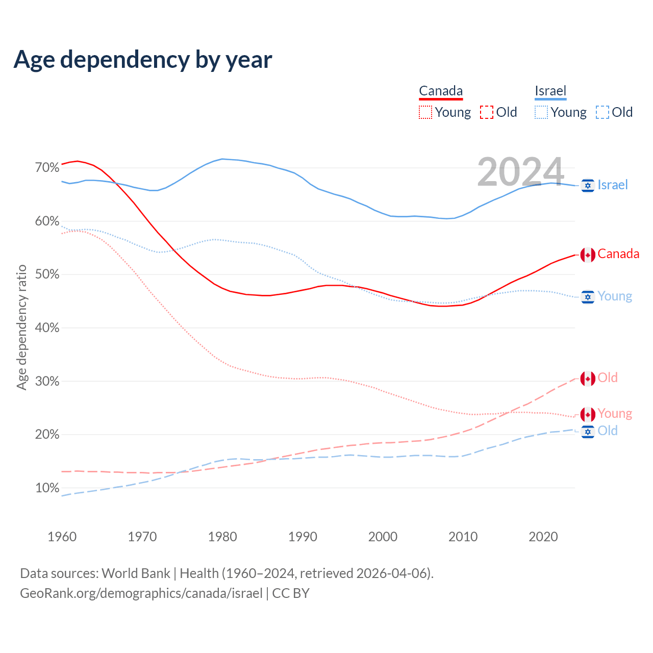 - Canada is ranked 38/196 by median age (oldest to youngest) vs 103/196 for Israel.