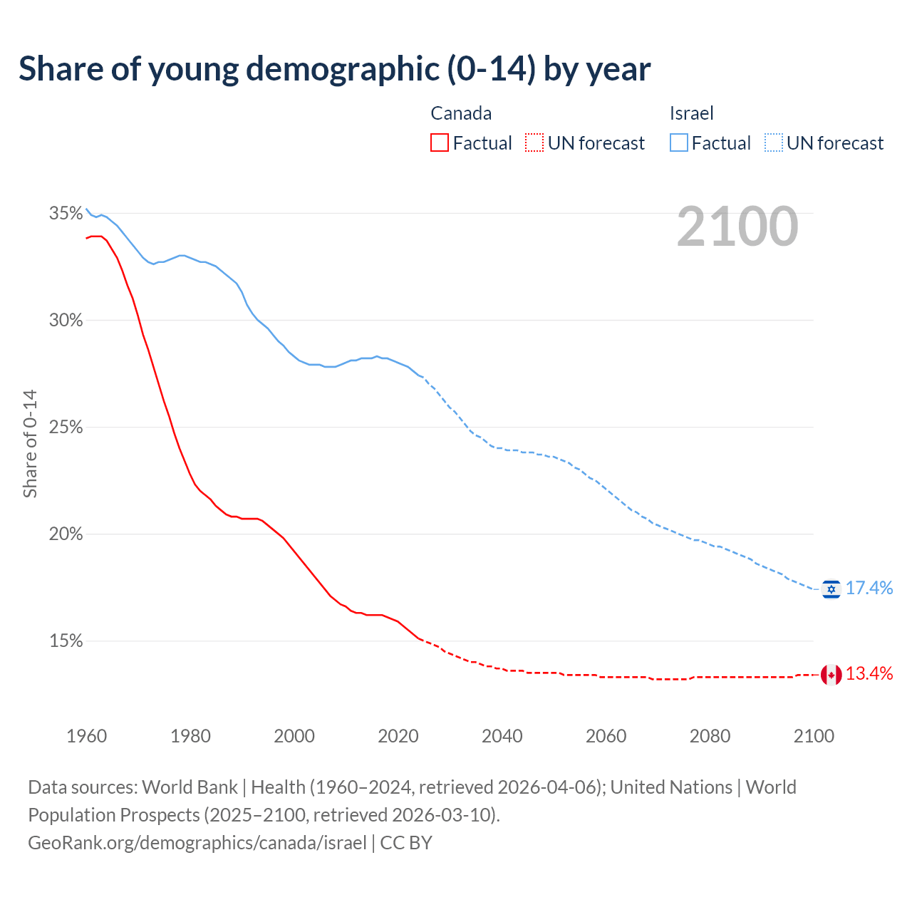- The share of young demographic (0-15 years old) in Canada is 15.1% vs 27.4% in Israel.