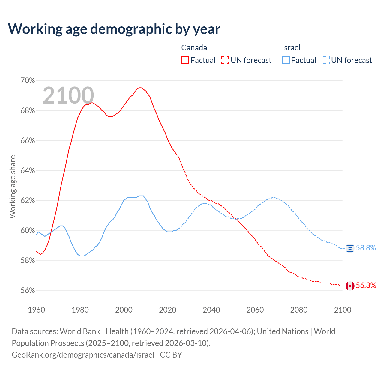 Median age Canada vs Israel, 1960-2100