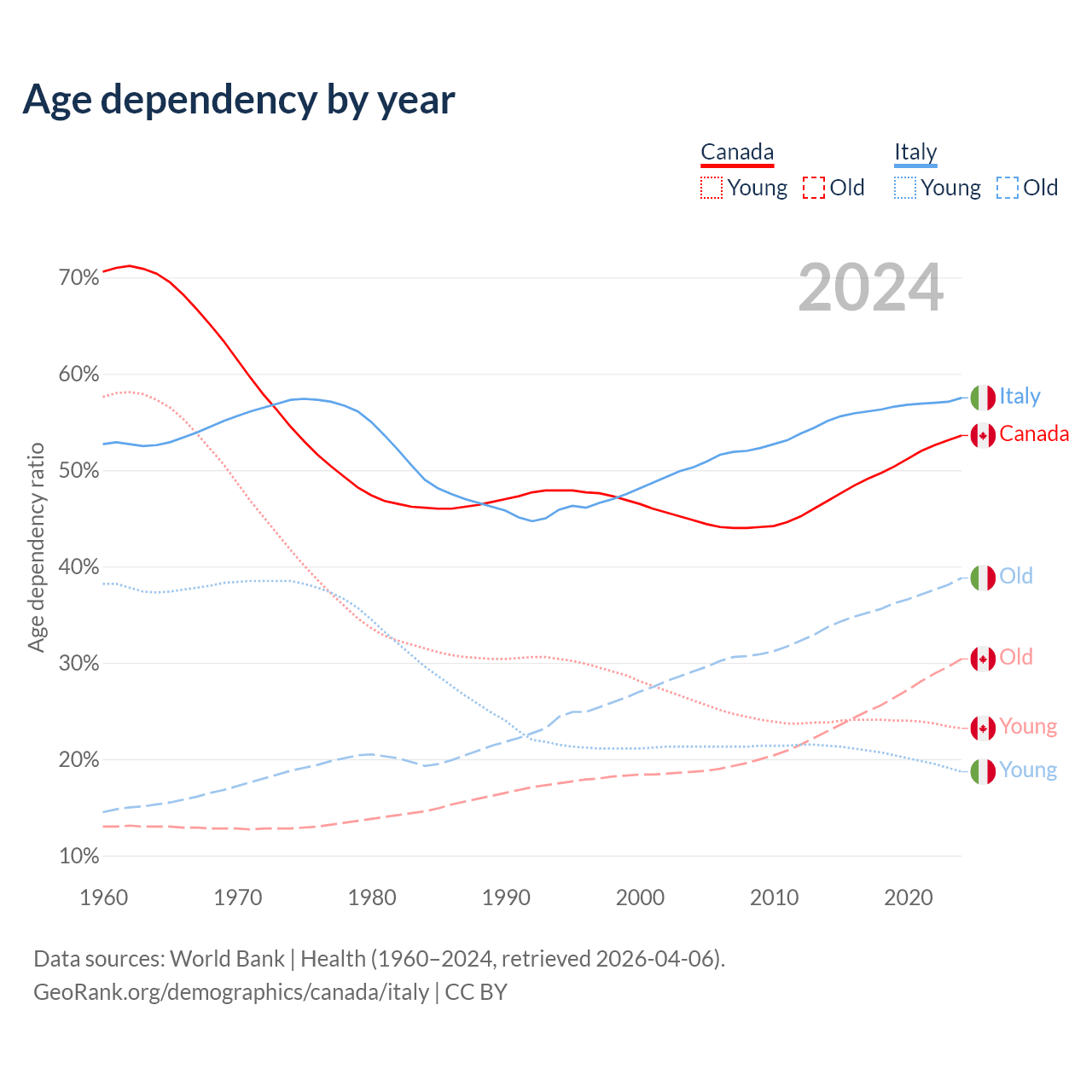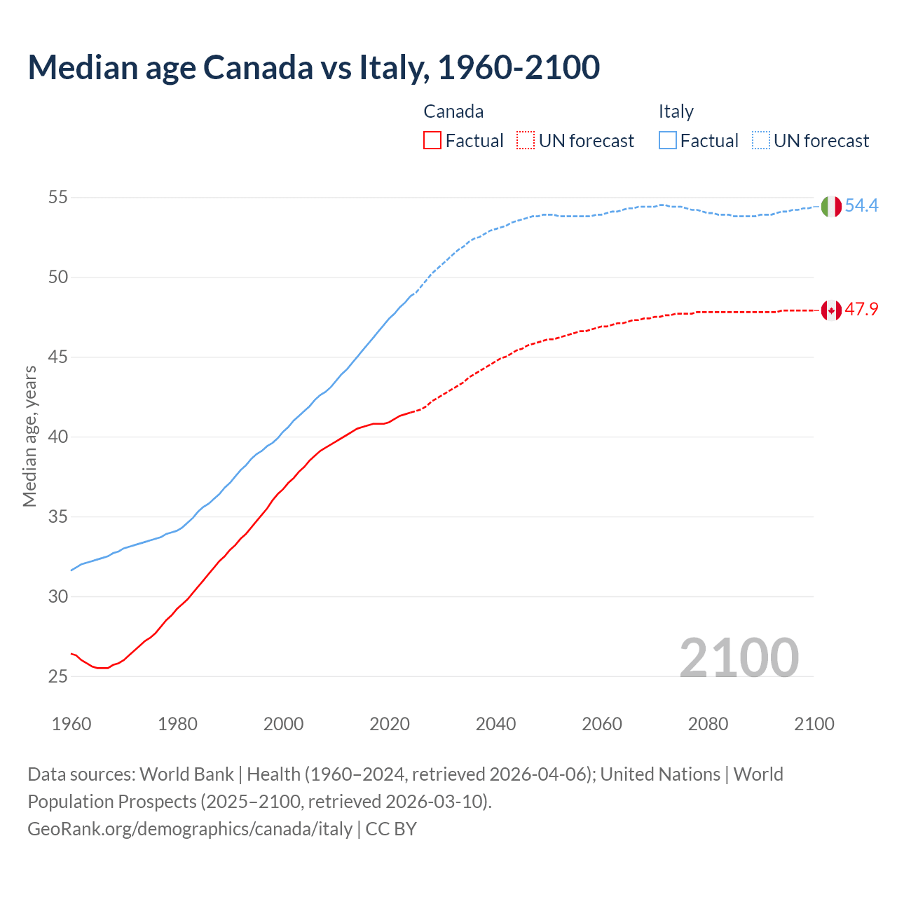 - Canada is ranked 38/196 by median age (oldest to youngest) vs 4/196 for Italy.