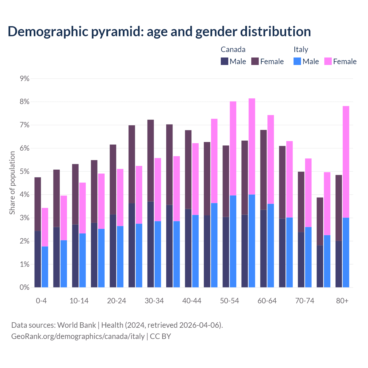 The share of older people aged 65 and over is 19.8% in Canada and 24.6% in Italy. Life expectancy in Canada compared to Italy .