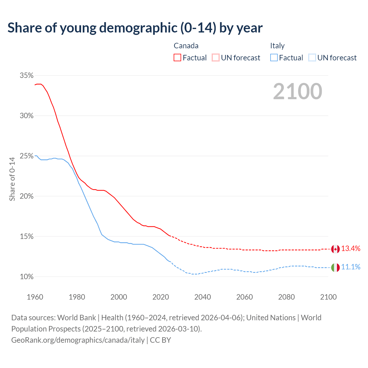 - The share of young demographic (0-15 years old) in Canada is 15.1% vs 11.9% in Italy.