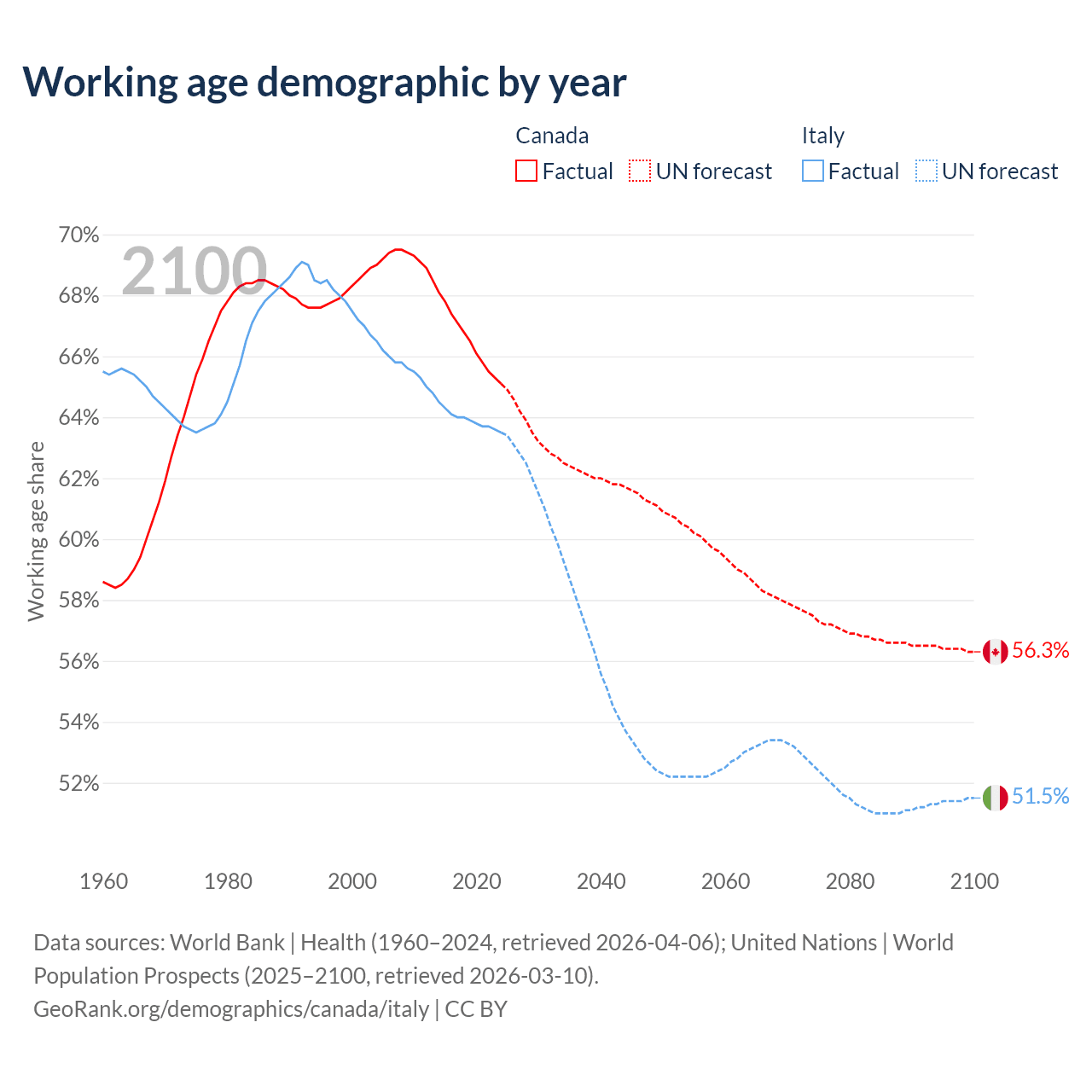 - Canada has 27.5M working age adults (aged 15-64) vs 37.2M in Italy.