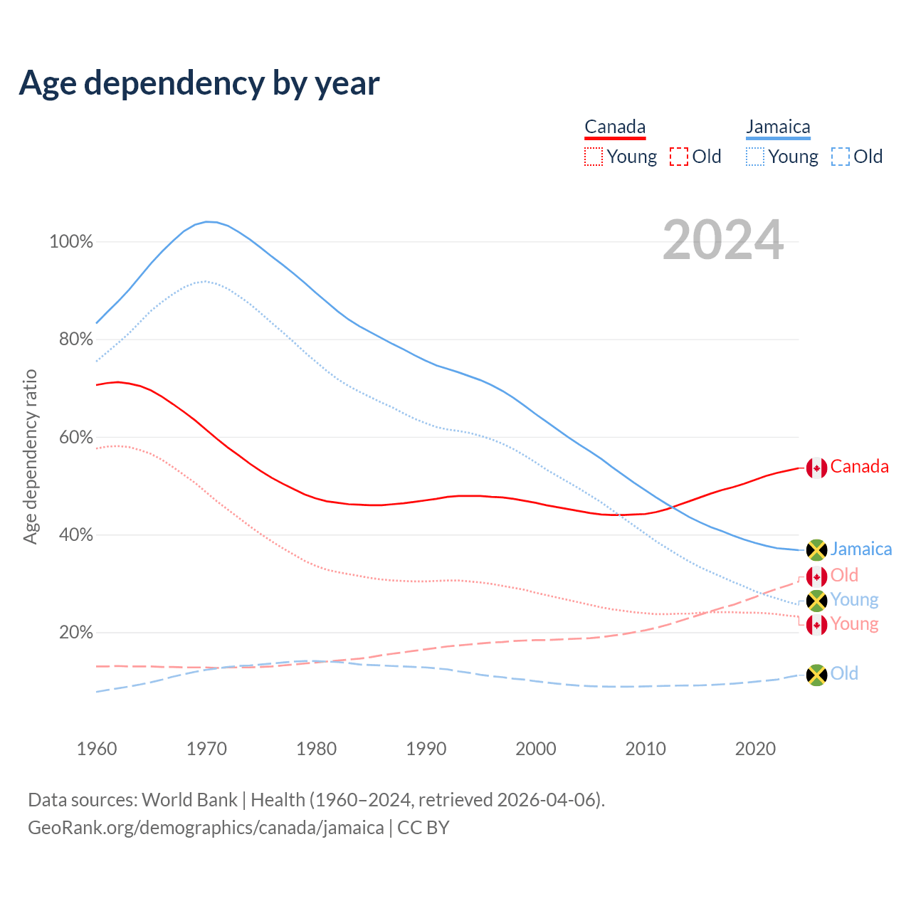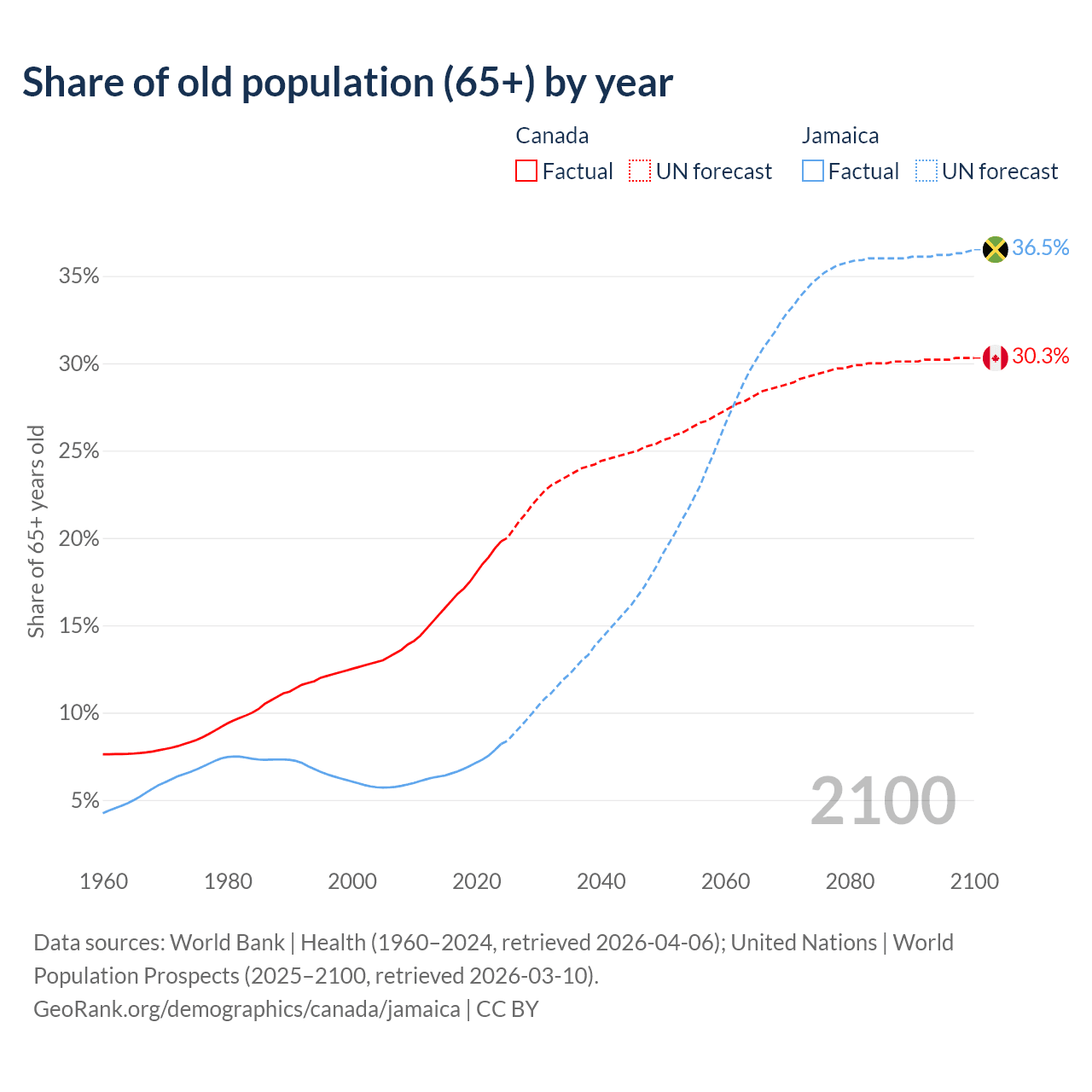 - The share of old-age demographic (65+) in Canada is 19.8% vs 8.21% in Jamaica.