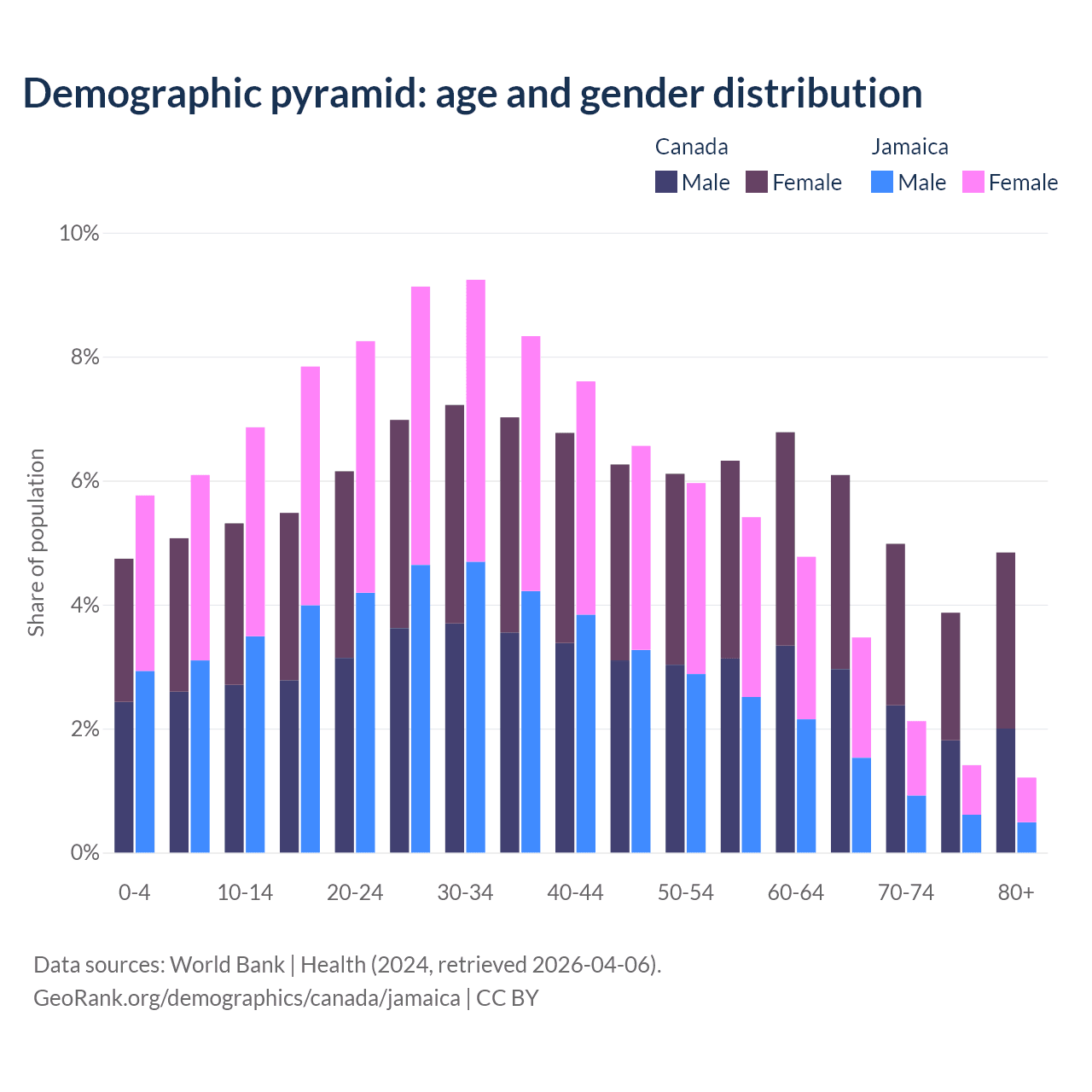 - As of 2026, the population of Canada is 42.2M vs 2.83M in Jamaica - 14.9 times difference.