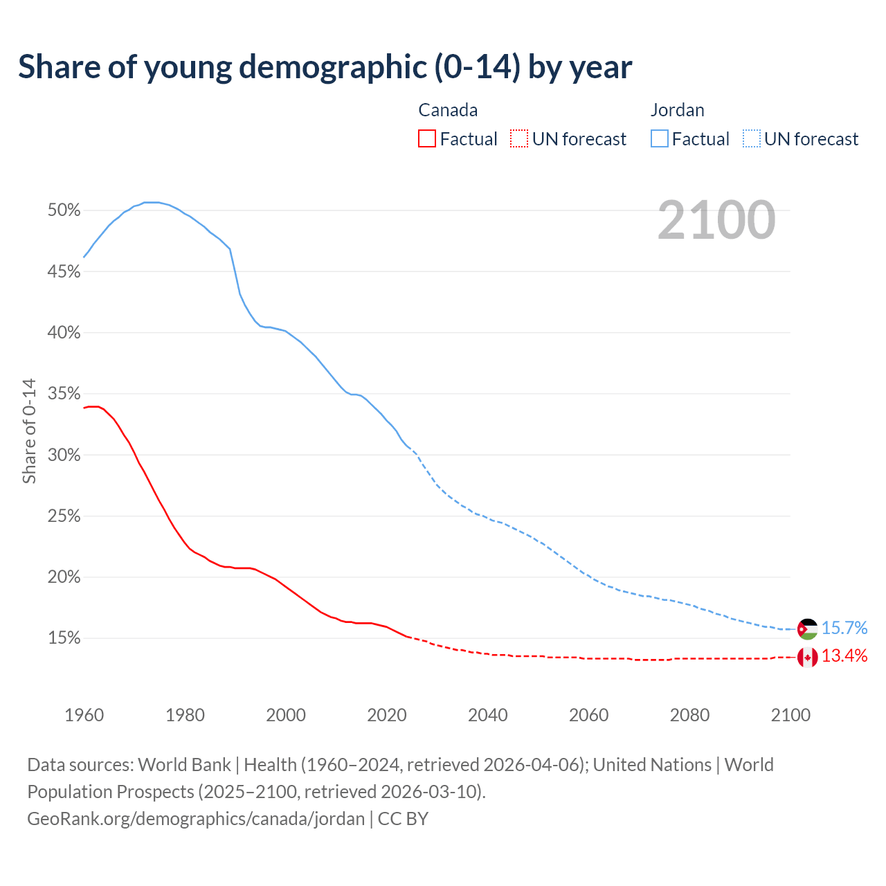 - The share of young demographic (0-15 years old) in Canada is 15.1% vs 30.7% in Jordan.