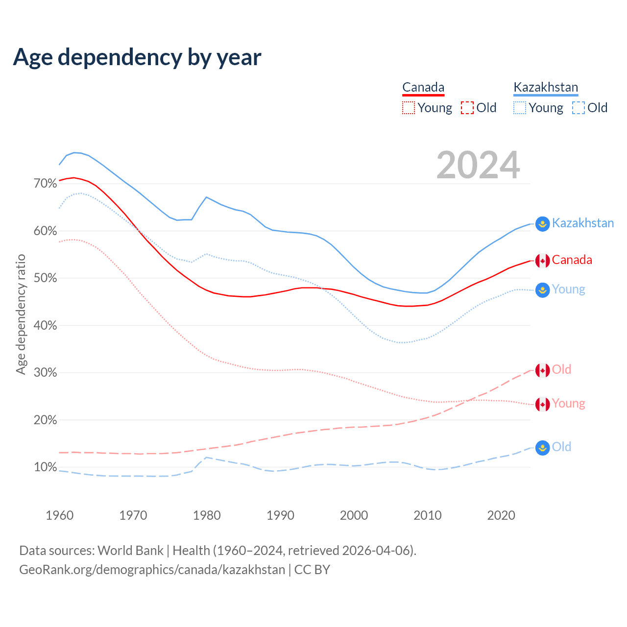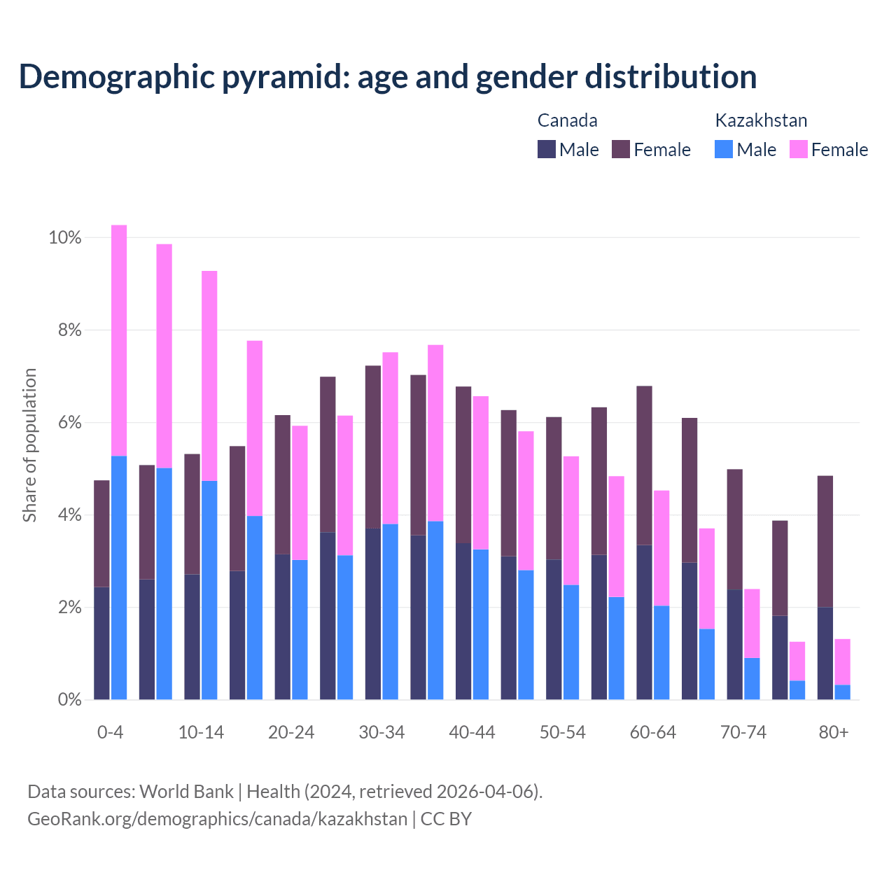 - Canada is ranked 38/196 by median age (oldest to youngest) vs 99/196 for Kazakhstan.