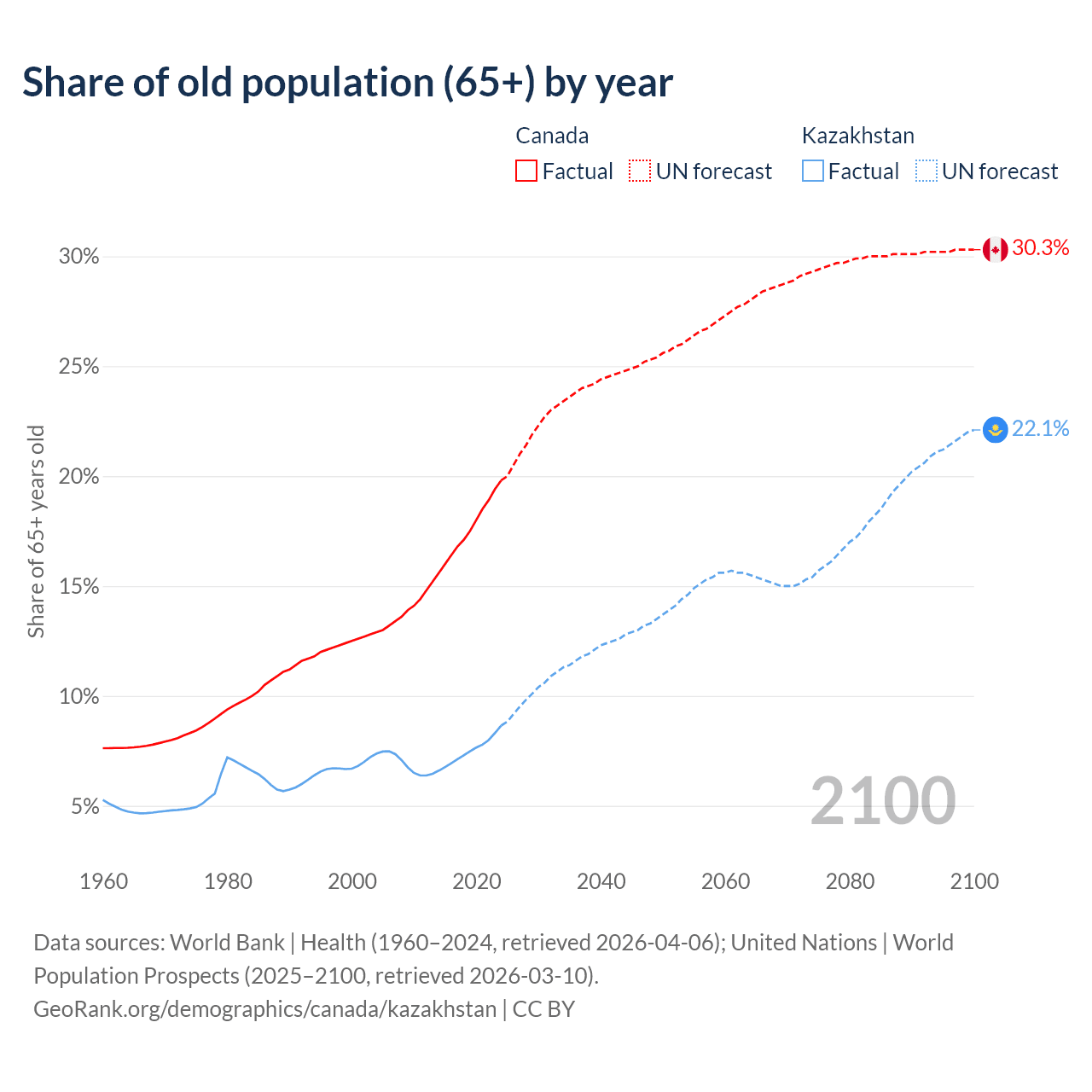 - The share of old-age demographic (65+) in Canada is 19.8% vs 8.65% in Kazakhstan.