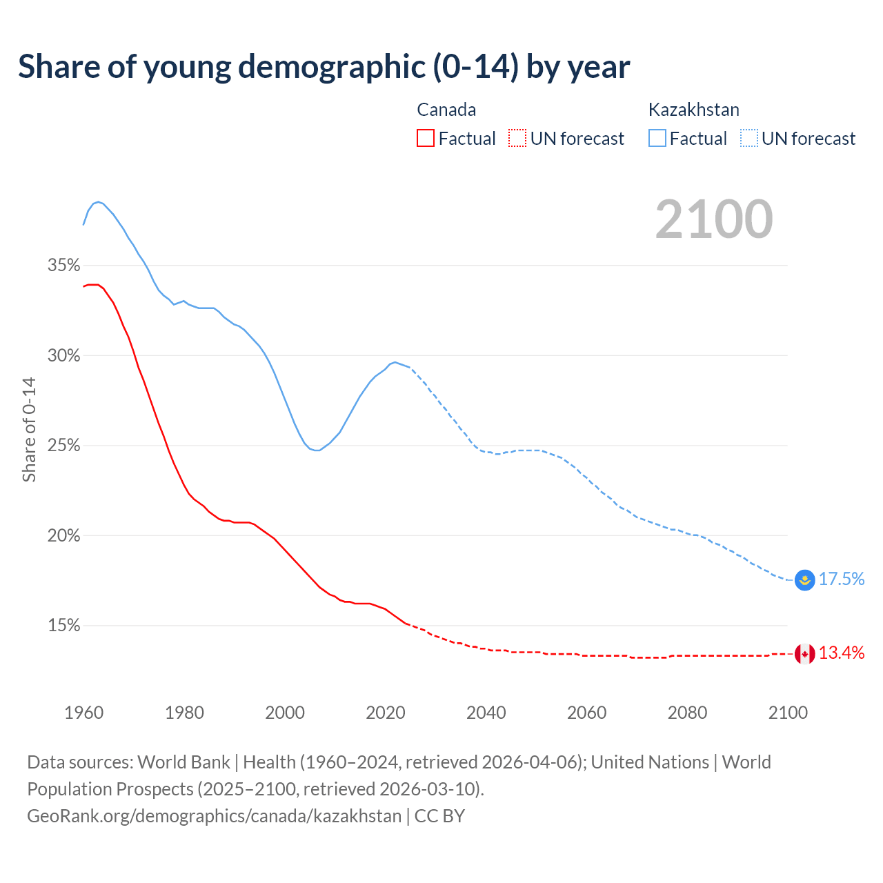 - The share of young demographic (0-15 years old) in Canada is 15.1% vs 29.4% in Kazakhstan.
