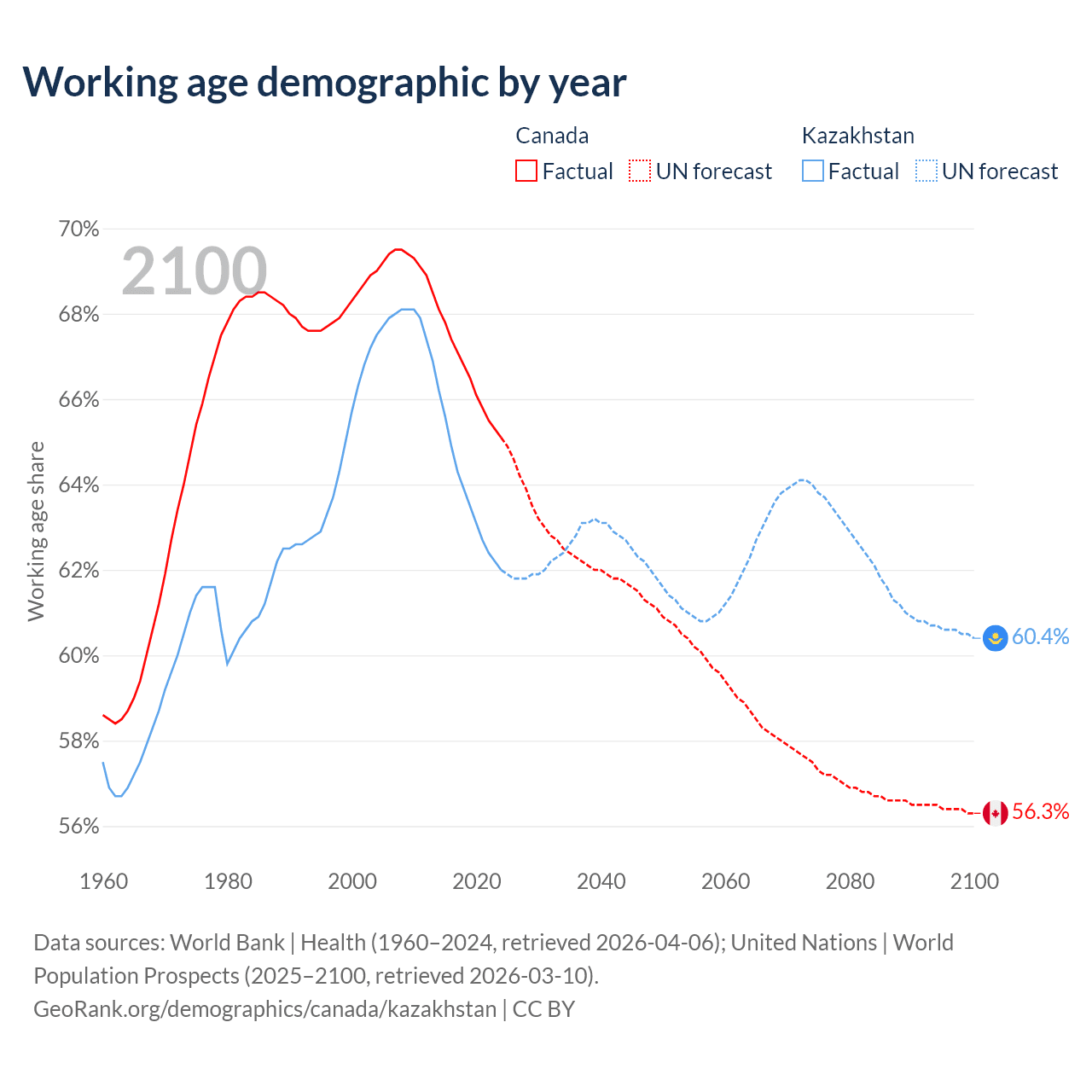 - Canada has 27.5M working age adults (aged 15-64) vs 13.1M in Kazakhstan.