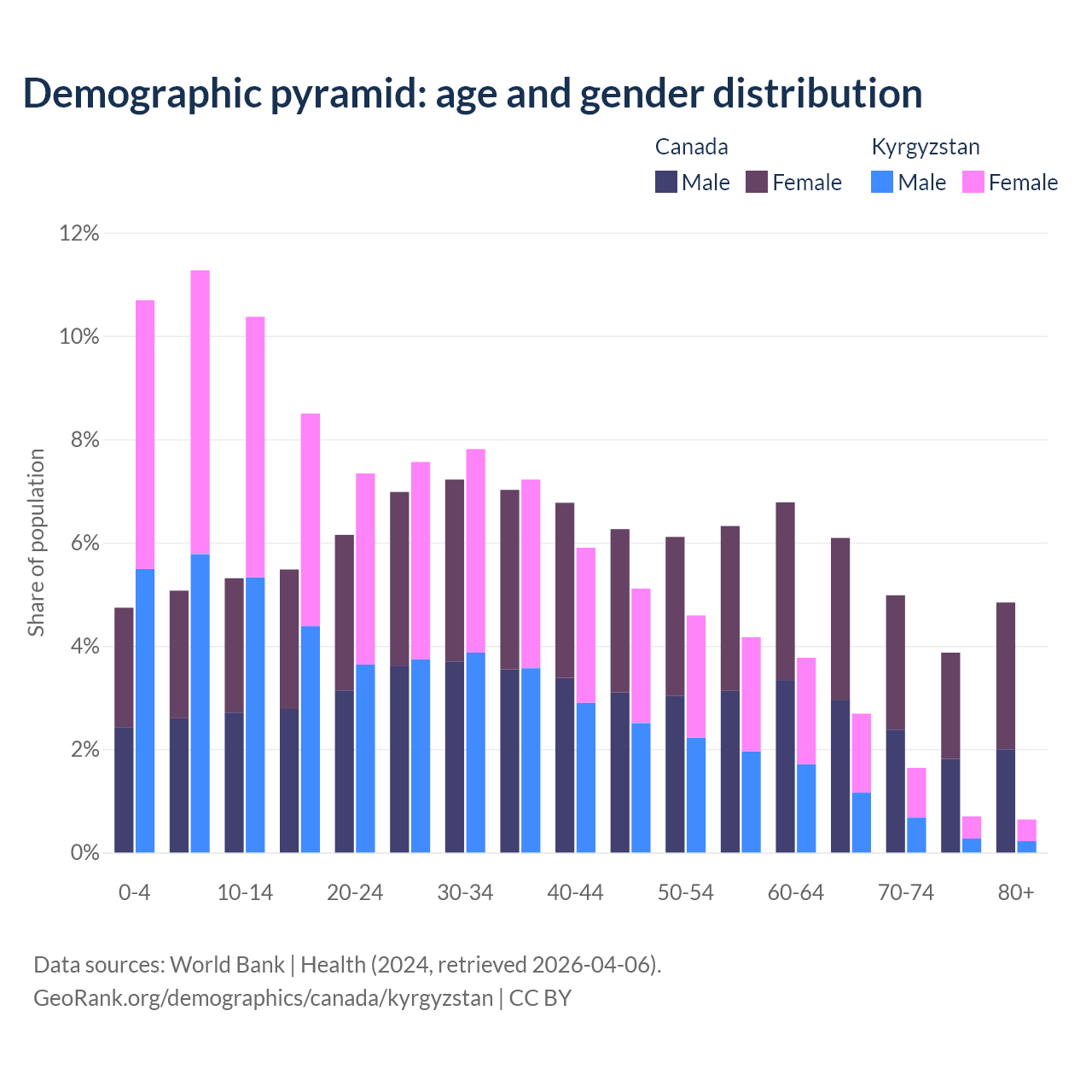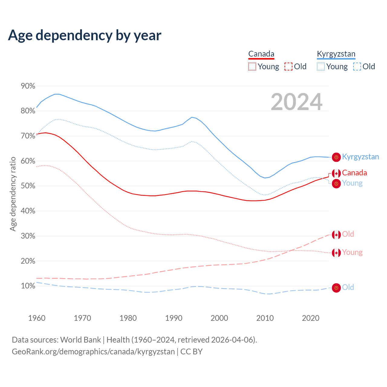 - The share of old-age demographic (65+) in Canada is 19.8% vs 5.68% in Kyrgyzstan.