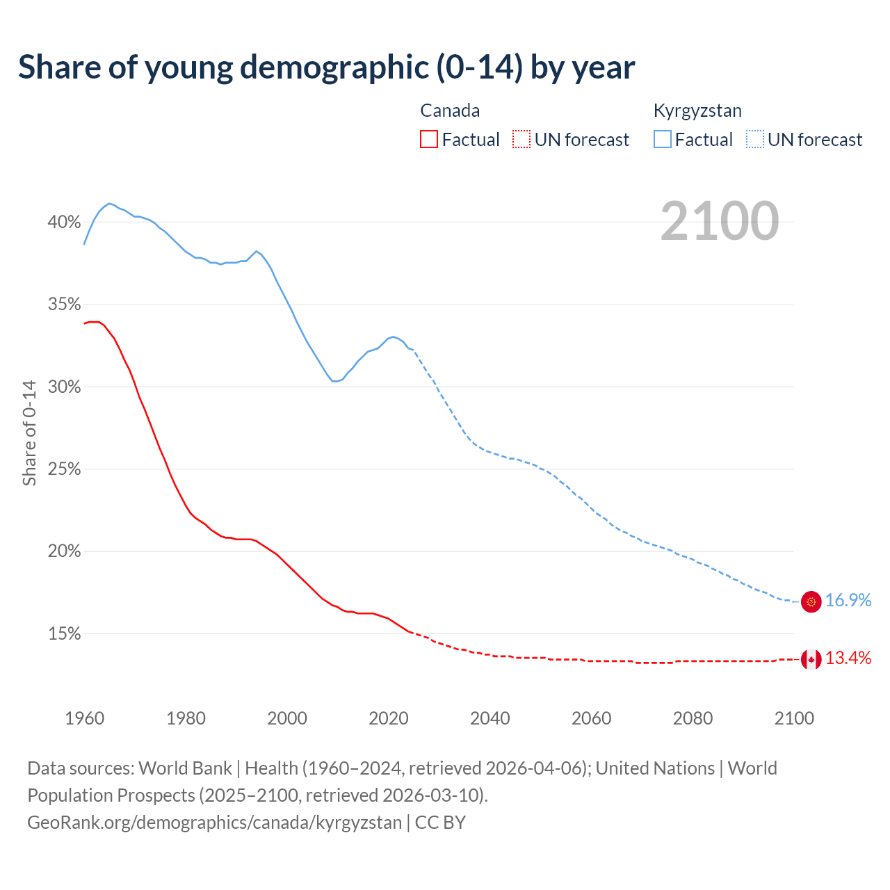 - The share of young demographic (0-15 years old) in Canada is 15.1% vs 32.3% in Kyrgyzstan.