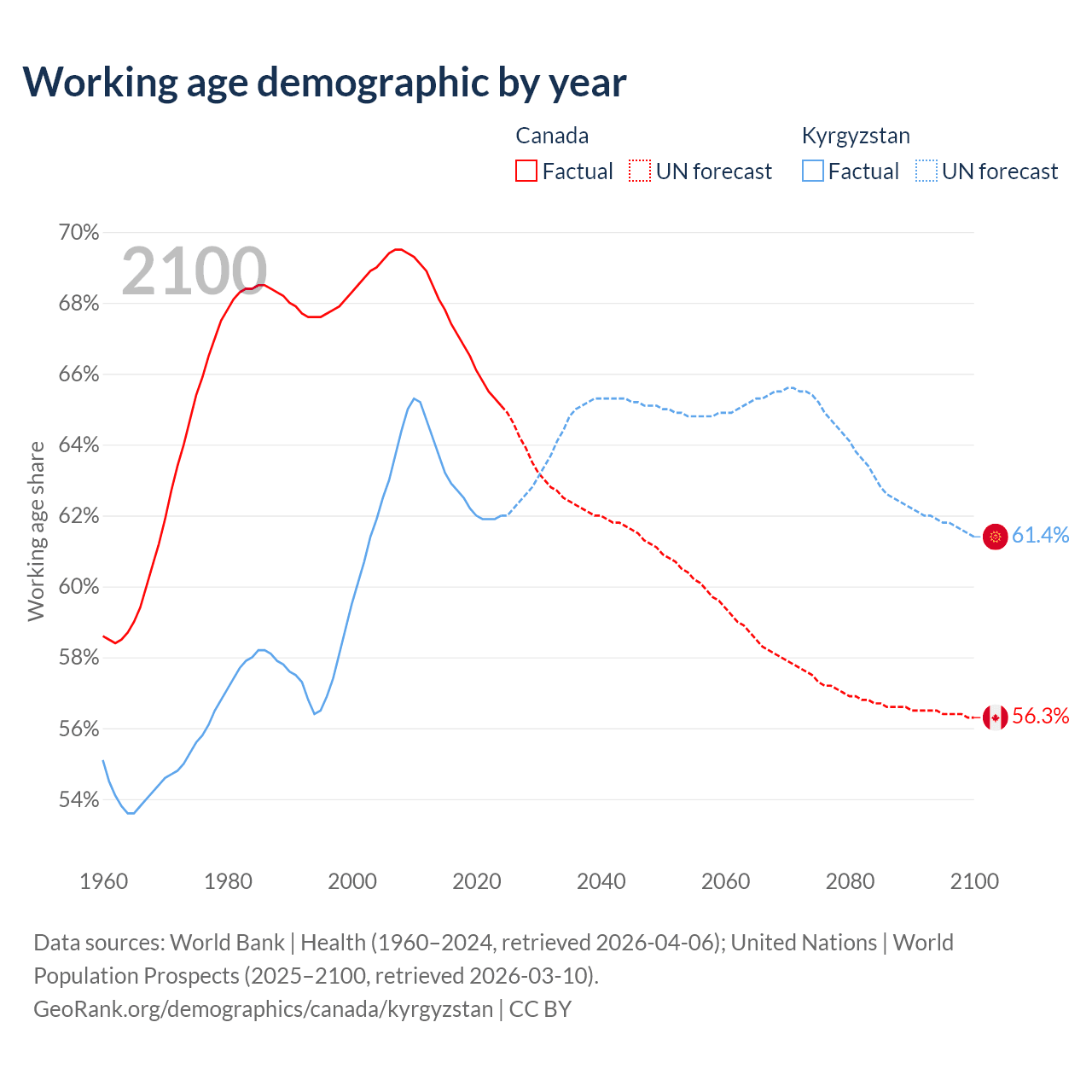 - Canada has 27.5M working age adults (aged 15-64) vs 4.63M in Kyrgyzstan.