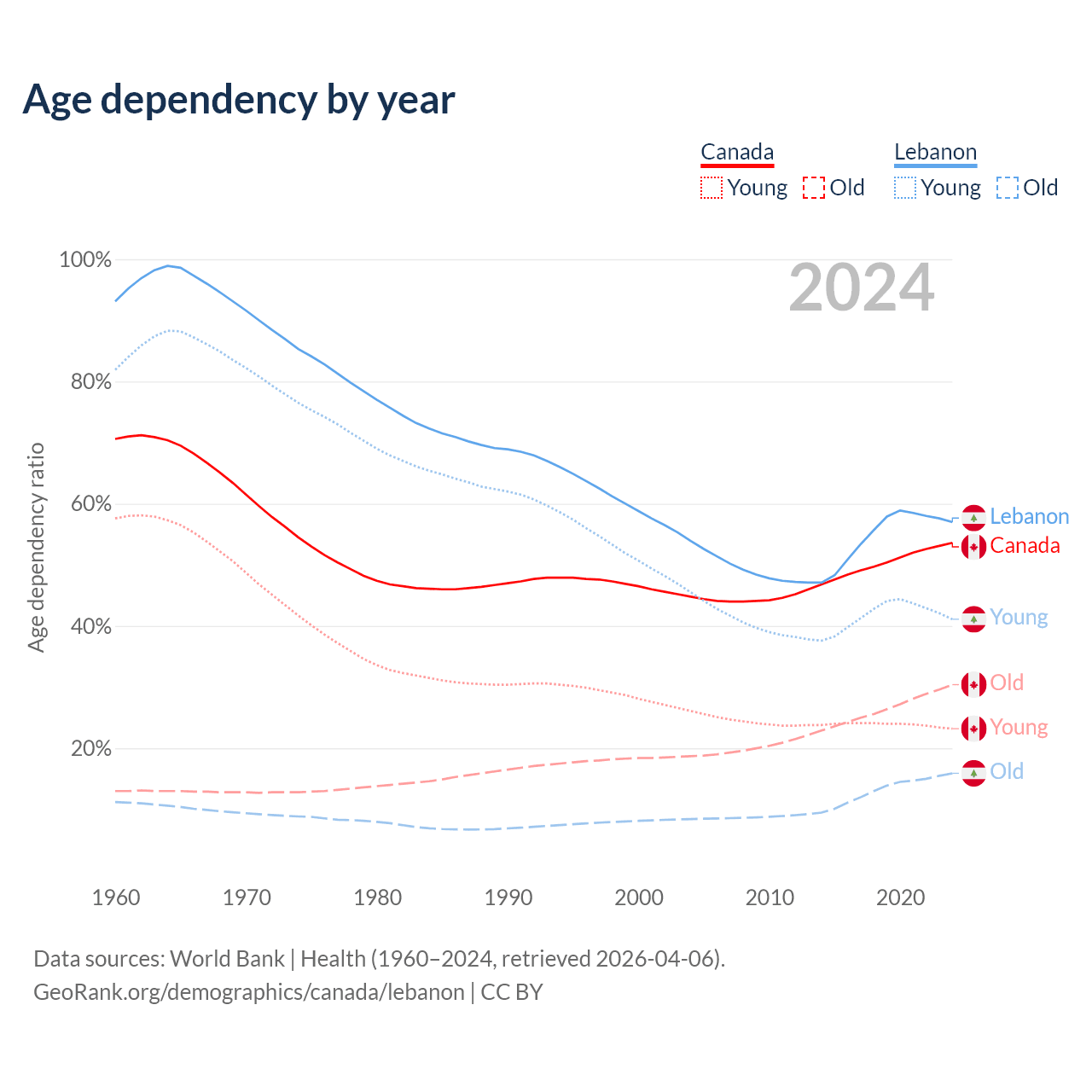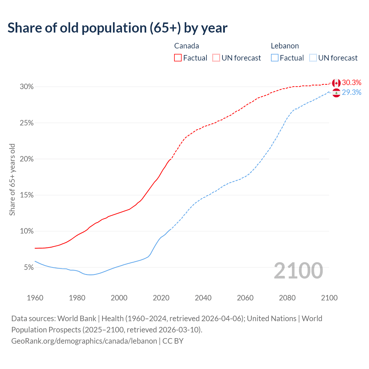 - The share of old-age demographic (65+) in Canada is 19.8% vs 10.1% in Lebanon.
