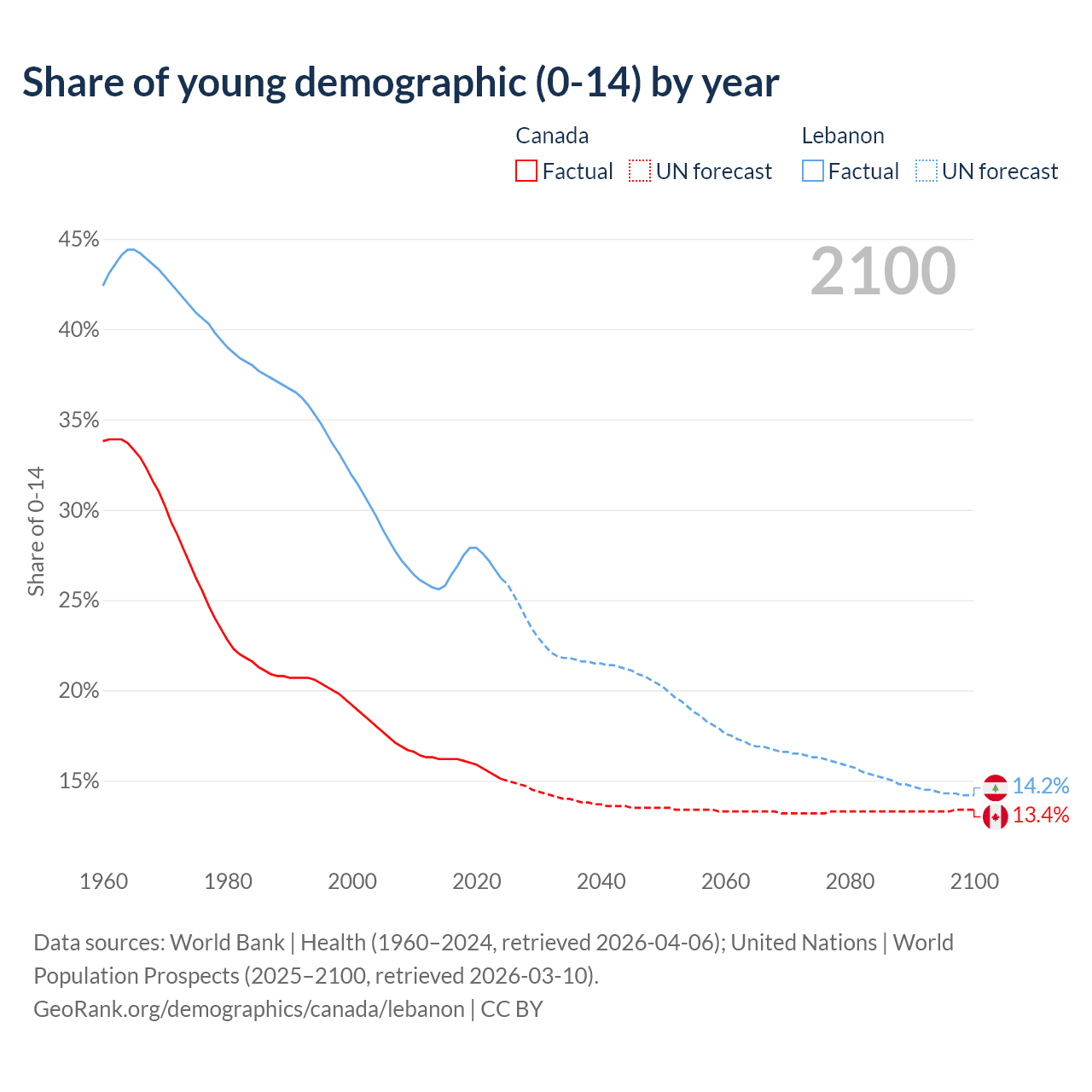 - The share of young demographic (0-15 years old) in Canada is 15.1% vs 26.2% in Lebanon.