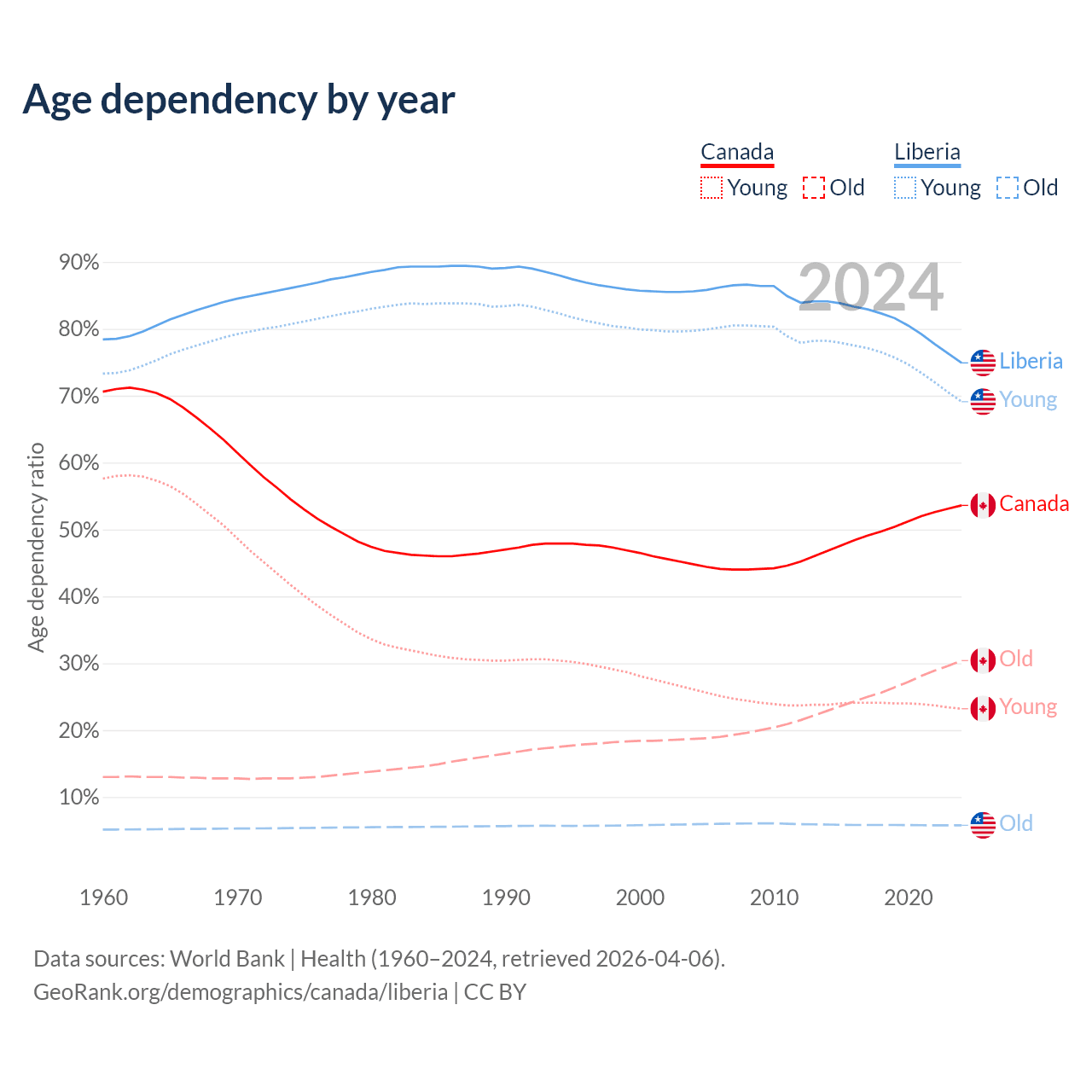 - The share of old-age demographic (65+) in Canada is 19.8% vs 3.3% in Liberia.
