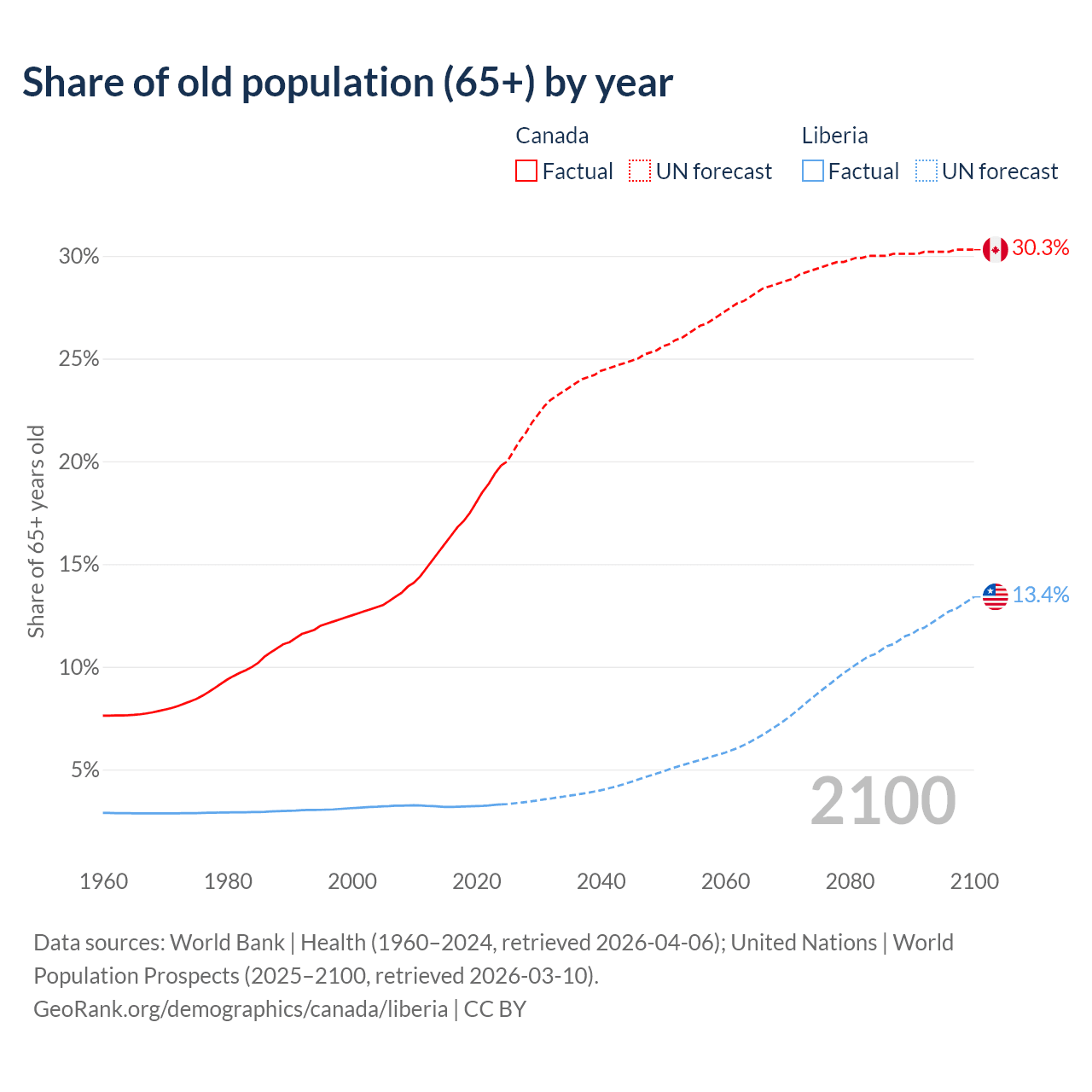 The share of older people aged 65 and over is 19.8% in Canada and 3.3% in Liberia. Life expectancy in Canada compared to Liberia .