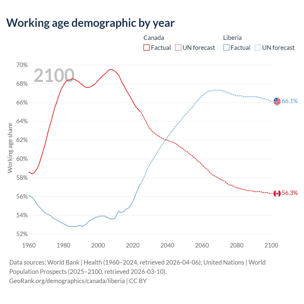 - Canada has 27.5M working age adults (aged 15-64) vs 3.37M in Liberia.