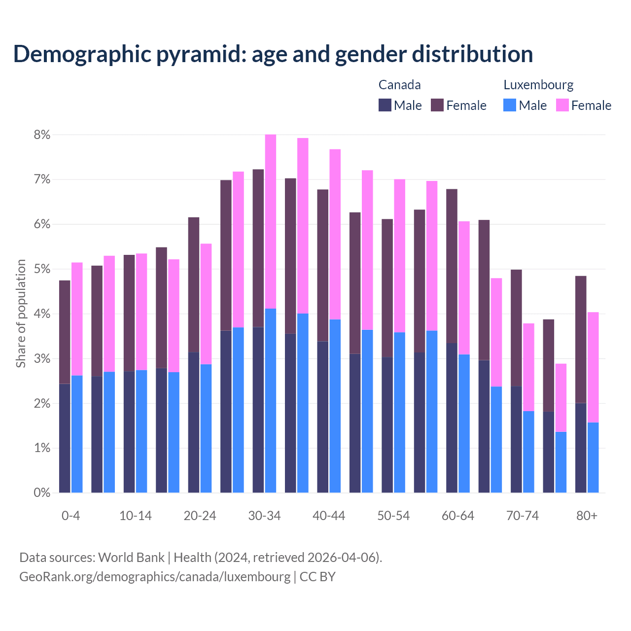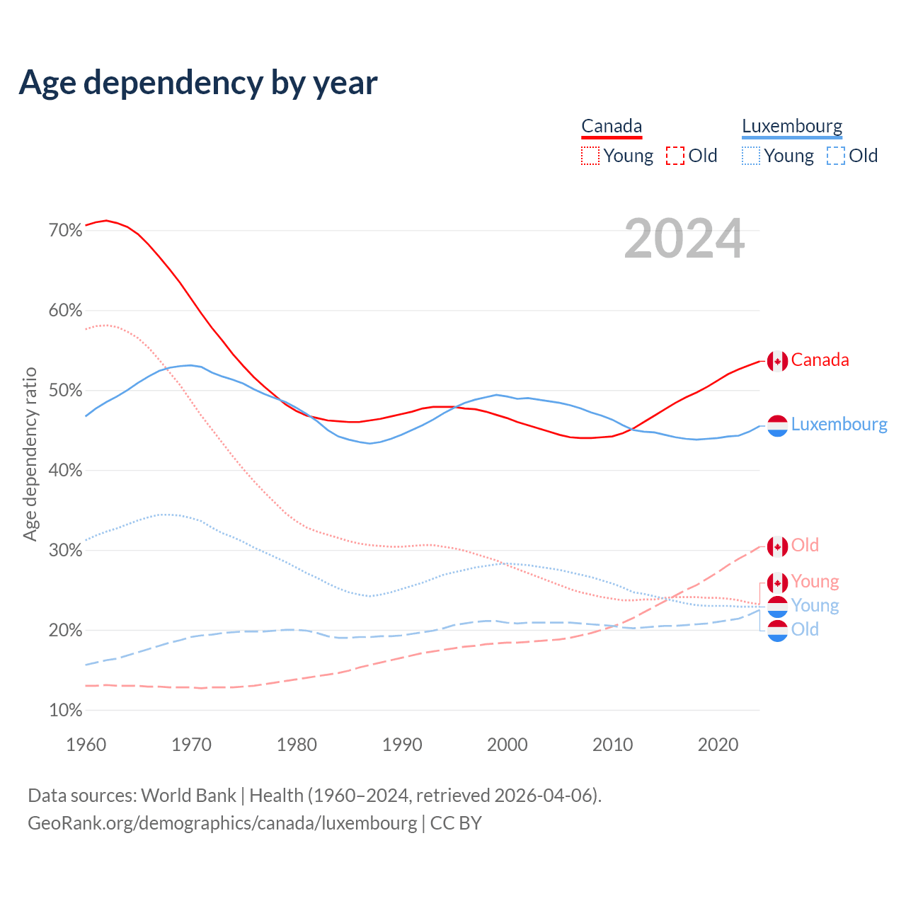 - Canada is ranked 38/196 by median age (oldest to youngest) vs 46/196 for Luxembourg.