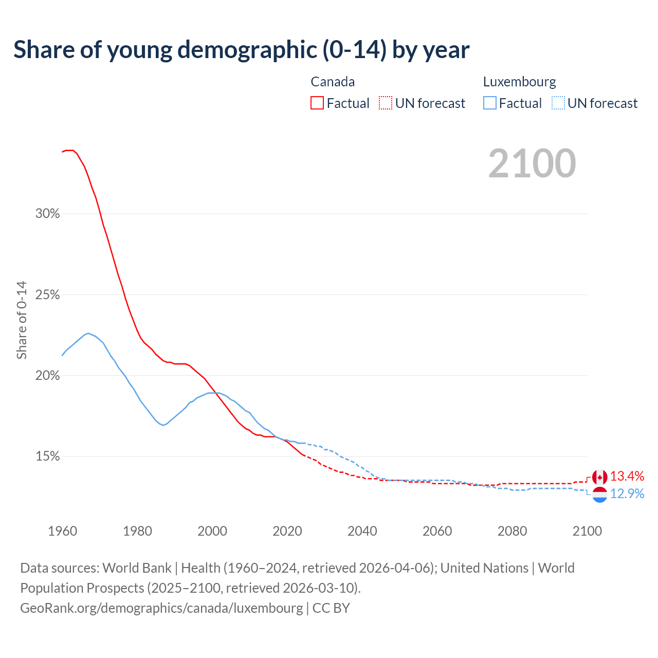 - The share of young demographic (0-15 years old) in Canada is 15.1% vs 15.8% in Luxembourg.